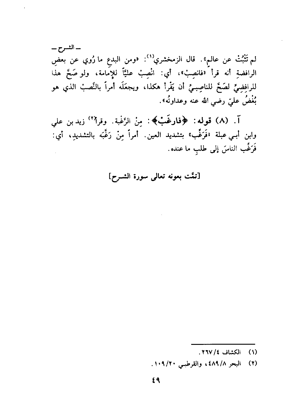 لم تَثْبُتْ عن عالمٍ» قال الزمخشري: «ومن البدعِ ما رُوي عن بعضِ الرافضةِ أنه قرأ» فانصِبْ «أي: انْصِبْ عليَّاً للإِمامة، ولو صَحَّ هذا للرافِضِيِّ لصَحَّ للناصِبيِّ أن يَقْرأ هكذا، ويجعَلَه أمراً بالنَّصبْ الذي هو بُغْضُ عليّ رضي الله عنه وعداوتُه» .