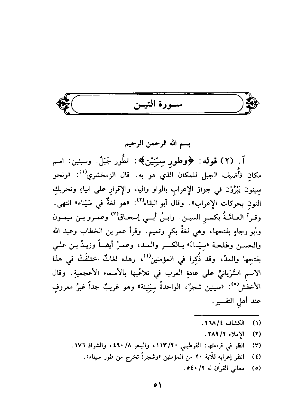 قوله: {وَطُورِ سِينِينَ} : الطُّور جَبَلٌ. وسينين: اسم مكانٍ فأُضيف الجبل للمكان الذي هو به. قال الزمخشري: «ونحو سِينون يَبْرُوْن في جواز الإِعرابِ بالواو والياء والإِقرارِ على الياءِ وتحريكِ النونِ بحركات الإِعراب» وقال أبو البقاء: «هو لغةٌ في سَيْناء» انتهى. وقرأ العامَّةُ بكسرِ السين. وابنُ أبي إسحاق وعمرو بن ميمون وأبو رجاءٍ بفتحها، وهي لغةُ بكرٍ وتميم. وقرأ عمر بن الخطاب وعبد الله والحسن وطلحة «سِيْناءَ» بالكسر، والمد، وعمرُ أيضاً وزيدُ بن علي بفتحِها والمدِّ، وقد ذُكِرا في المؤمنين، وهذه لغاتٌ اختلفَتْ في هذا الاسمِ السُّرْيانيِّ على عادةِ العرب في تلاعُبها بالأسماء الأعجميةِ. وقال الأخفش: «سينين شجرٌ، الواحدةُ سِيْنِية» وهو غريبٌ جداً غيرُ معروفٍ عن أهلِ التفسير.