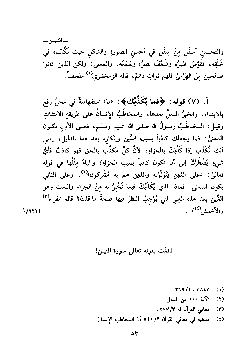 والتحسينِ أسفَل مِنْ سِفْل في أحسنِ الصورةِ والشكلِ حيث نَكَّسْناه في خلْقِه فقوَّسَ ظهرُه وضَعُفَ بصرُه وسَمْعُه. والمعنى: ولكن الذين كانوا صالحين مِنْ الهرمى فلهم ثوابٌ دائمٌ، قاله الزمخشري ملخصاً.