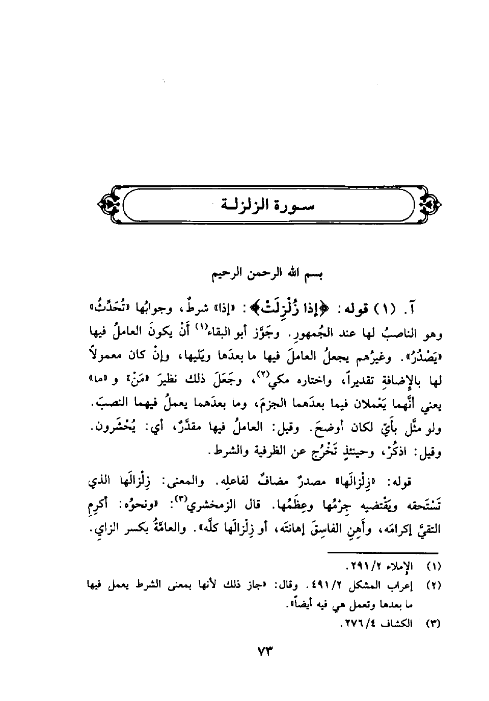 قوله: {زِلْزَالَهَا} مصدرٌ مضافٌ لفاعلِه. والمعنى: زِلْزالَها الذي تَسْتَحقه ويَقْتضيه جِرْمُها وعِظَمُها. قال الزمخشري: «ونحُوه: أكرِمِ التقيَّ إكرامَه، وأَهِنِ الفاسِقَ إهانتَه، أو زِلْزالَها كلَّه» والعامَّةُ بكسر الزايِ.