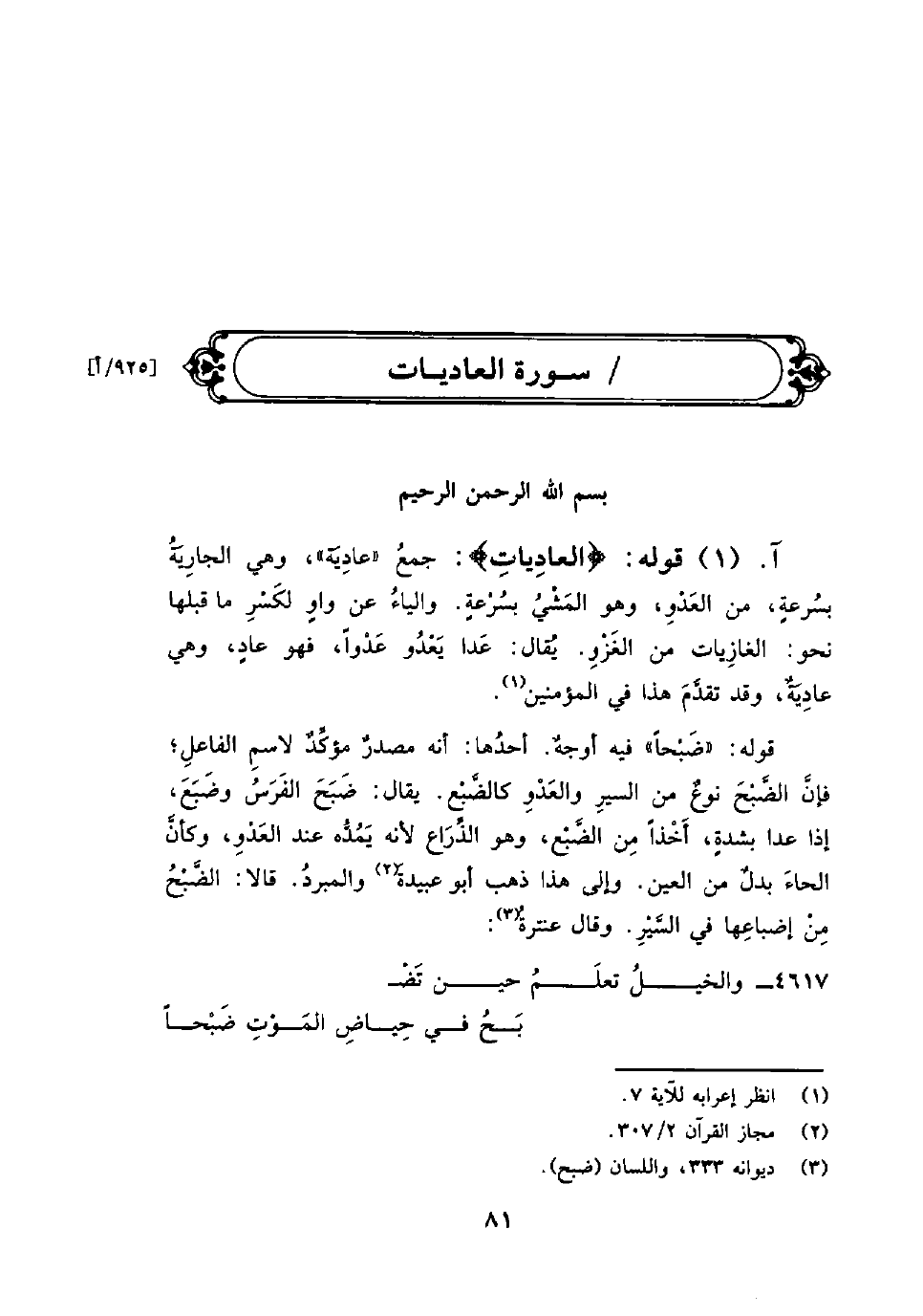 قوله: {والعاديات} : جمعُ «عادِيَة» وهي الجاريَةُ بسُرعةٍ، من العَدْوِ، وهو المَشْيُ بسُرْعةٍ. والياءُ عن واوٍ لكَسْرِ ما قبلها نحو: الغازِيات من الغَزْوِ. يُقال: عَدا يَعْدُوا عَدْواً، فهو عادٍ وهي عادِيَةٌ، وقد تقدَّمَ هذا في المؤمنين.