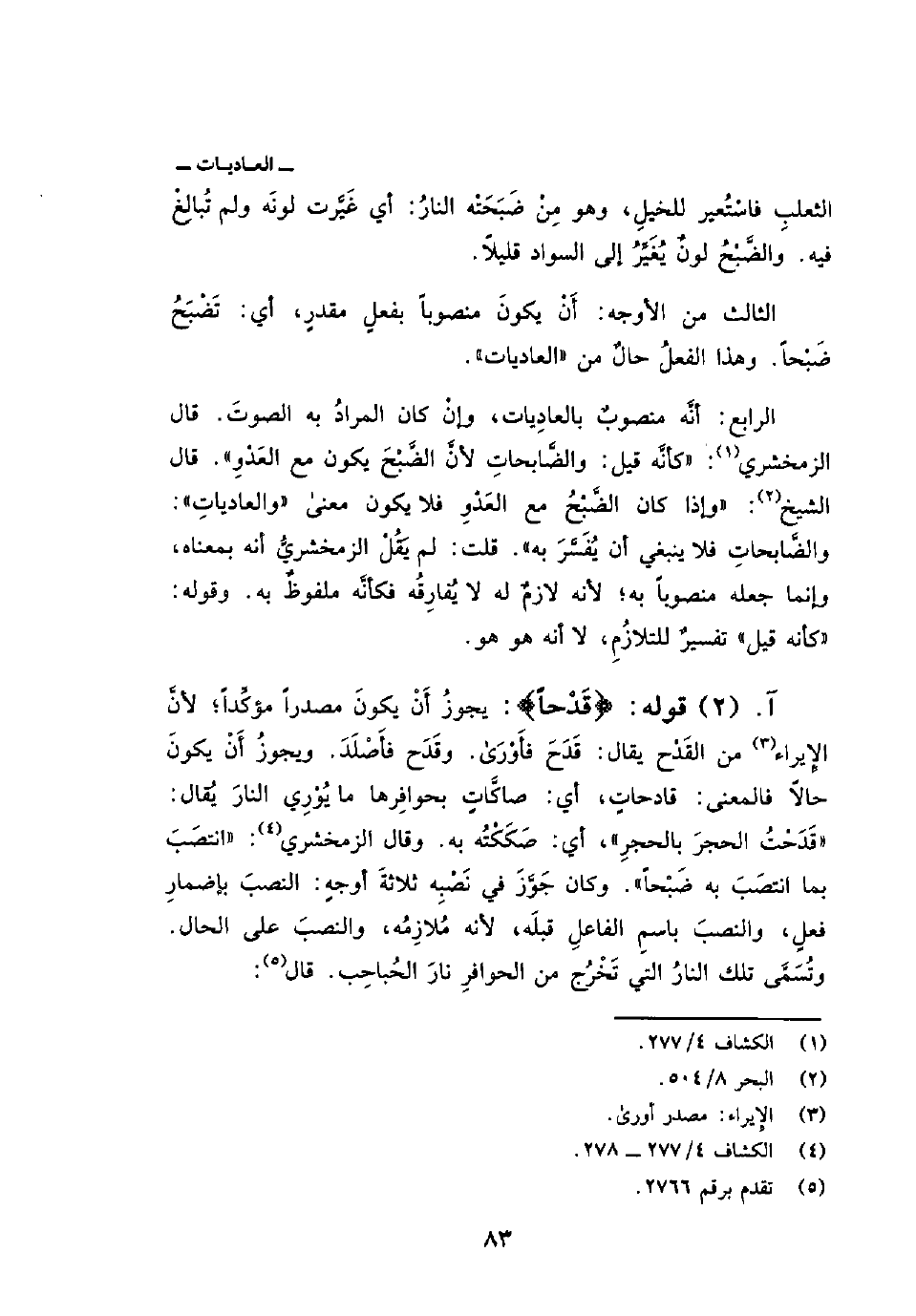 قوله: {قَدْحاً} : يجوزُ أَنْ يكونَ مصدراً مؤكِّداً؛ لأنَّ الإِيراء من القَدْح يقال: قَدَحَ فَأَوْرَى وقَدَح فأَصْلَدَ. ويجوزُ أَنْ يكونَ حالاً فالمعنى: قادحاتٍ، أي: صاكَّاتٍ بحوافِرها ما يُوْرِي النارَ يُقال: «قَدَحْتُ الحجرَ بالحجرِ» أي: صَكَكْتُه به. وقال الزمخشري: «انتصَبَ بما انتصَبَ به ضَبْحاً» . وكان جَوَّزَ في نَصْبِه ثلاثةَ أوجهٍ: النصبَ بإضمارِ فعلٍ، والنصبَ باسمِ الفاعلِ قبلَه، لأنه مُلازِمُه، والنصبَ على الحال. وتُسَمَى تلك النارُ التي تَخْرُج من الحوافرِ نارَ الحُباحِب. قال: