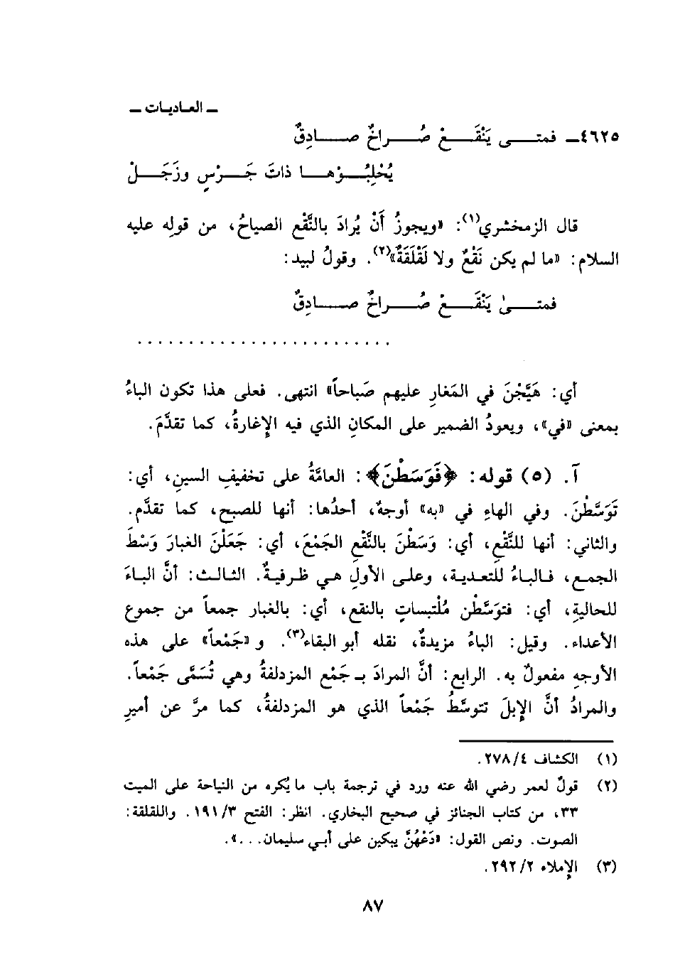 قال الزمخشري: «ويجوزُ أَنْ يُرادَ بالنَّقْع الصياحُ، من قولِه عليه السلام:» ما لم يكن نَقْعٌ ولا لَقْلَقَةٌ «وقولُ لبيد: