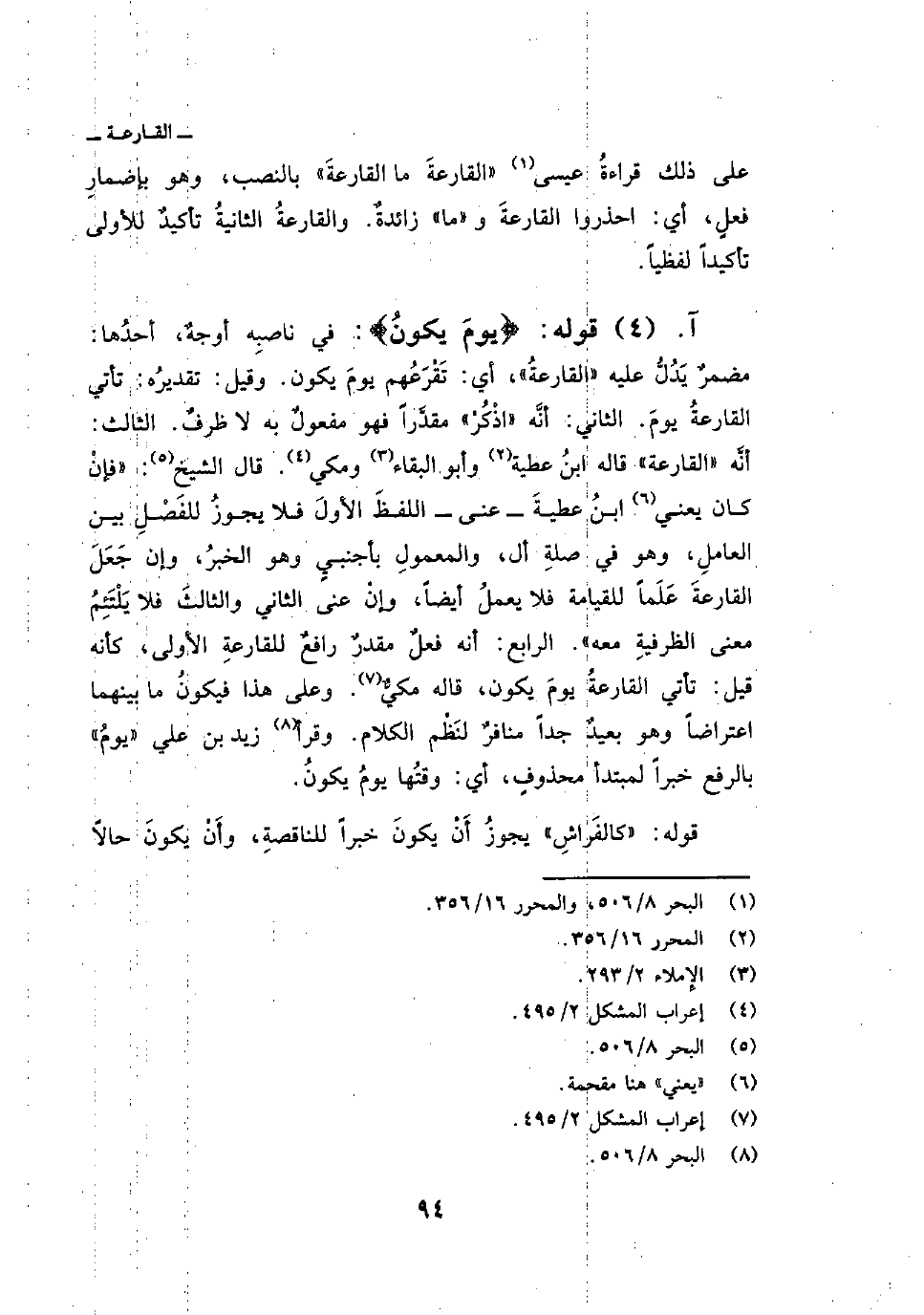 قوله: {يَوْمَ يَكُونُ} : في ناصبِه أوجهٌ، أحدُها: مضمرٌ يَدُلُّ عليه «القارعةُ، أي: تَقْرَعُهم يومَ يكون. وقيل: تقديرُه: تأتي القارعةُ يومَ. الثاني: أنَّه» اذْكُرْ «مقدَّراً فهو مفعولٌ به لا ظرفٌ. الثالث: أنَّه» القارعة «قاله ابنُ عطية وأبو البقاء ومكي. قال الشيخ:» فإنْ كان يعني ابنُ عطيةَ عني اللفظَ الأولَ فلا يجوزُ للفَصْلِ بين العاملِ، وهو في صلةِ أل، والمعمولِ بأجنبيٍ وهو الخبرُ، وإن جَعَلَ القارعةَ عَلَماً للقيامة فلا يعملُ أيضاً، وإنْ عنى الثاني والثالثَ فلا يَلْتَئِمُ معنى الظرفيةِ معه «. الرابع: أنه فعلٌ مقدرٌ رافعٌ للقارعةِ الأولى، كأنه قيل: تأتي القارعةُ يومَ يكون، قال مكيٌّ. وعلى هذا فيكونُ ما بينهما اعتراضاً وهو بعيدٌ جداً منافرٌ لنَظْم الكلام. وقرأ زيد بن علي» يومُ «بالرفع خبراً لمبتدأ محذوفٍ، أي: وقتُها يومُ يكونُ.