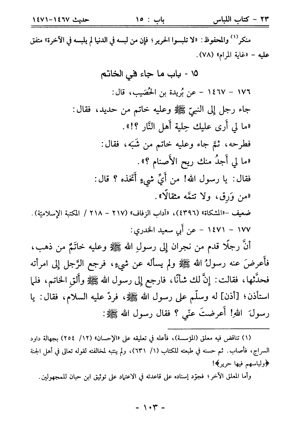 (¬1) تناقض فيه معلق (المؤسسة)، فأعله في تعليقه على "الإحسان" (12/ 254) بجهالة داود السراج، فأصاب. ثم حسنه في طبعته للكتاب (1/ 631)، ولم ينتبه لمخالفته لقوله تعالى في أهل الجنة {وَلِبَاسُهُمْ فِيهَا حَرِيرٌ}!