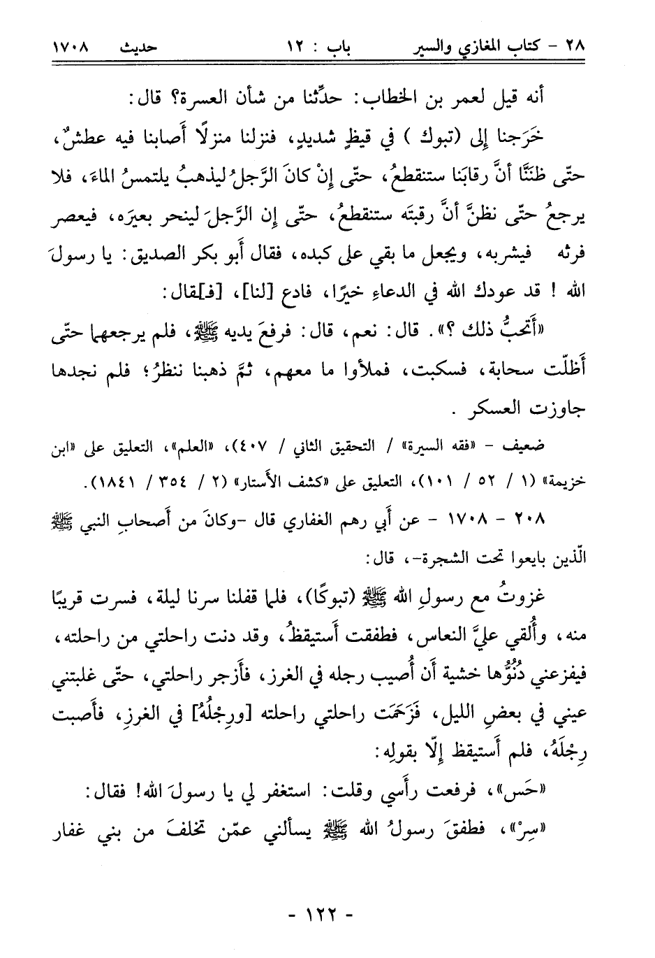 غزوتُ مع رسولِ الله - صلى الله عليه وسلم - (تبوكًا)، فلما قفلنا سرنا ليلة، فسرت قريبًا منه، وأُلقي عليَّ النعاس، فطفقت أَستيقظُ، وقد دنت راحلتي من راحلته، فيفزعني دُنُوُّها خشية أَن أُصيب رجله في الغرز، فأَزجر راحلتي، حتّى غلبتني عيني في بعضِ الليل، فَزَحَمَت راحلتي راحلته [ورِجْلُهُ] في الغرزِ، فأَصبت رِجْلَهُ، فلم أَستيقظ إِلّا بقولِه: