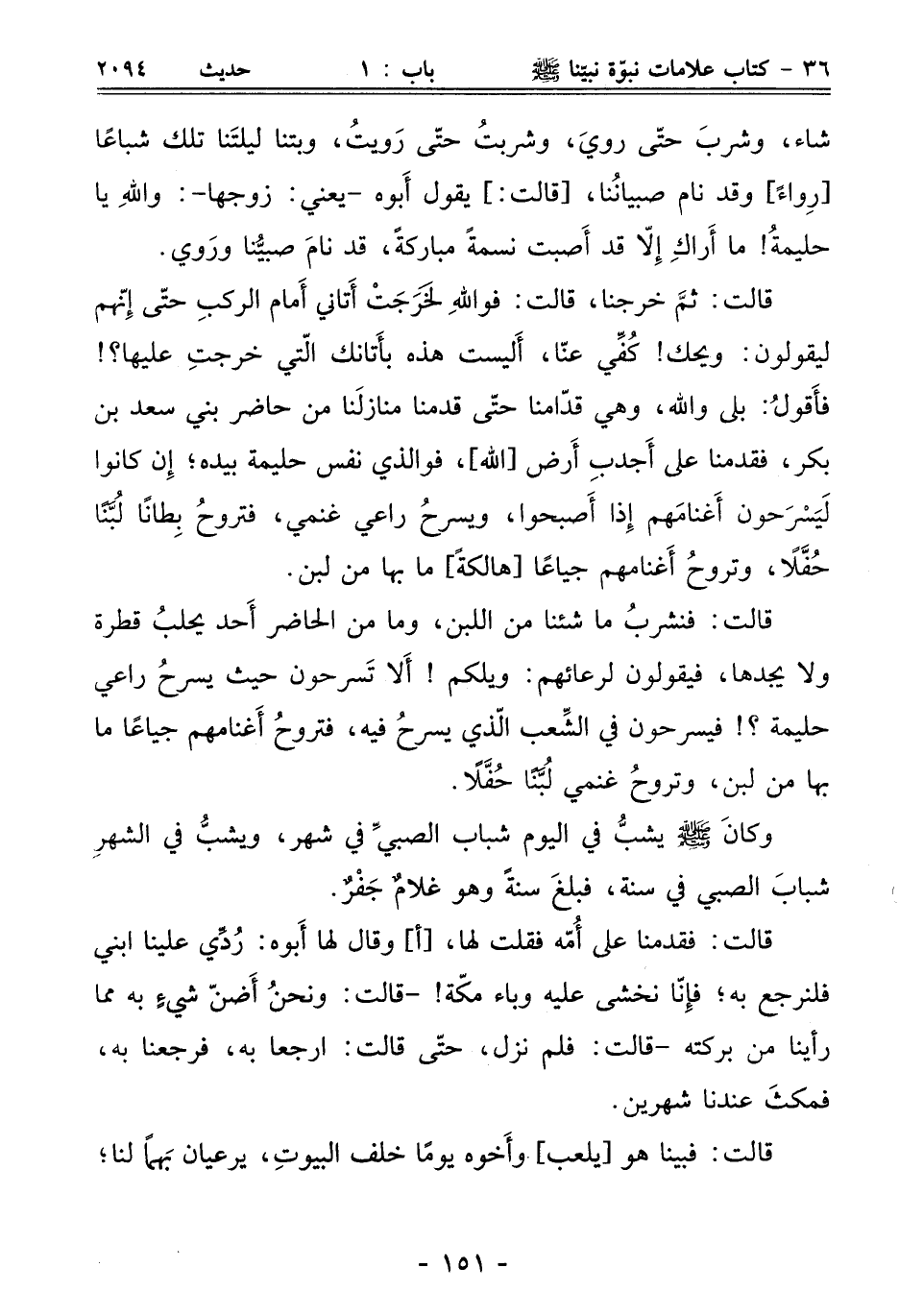 شاء، وشربَ حتّى رويَ، وشربتُ حتّى رَويتُ، وبتنا ليلتَنا تلك شباعًا [رِواءً] وقد نام صبيانُنا، [قالت:] يقول أَبوه - يعني: زوجها -: واللهِ يا حليمةُ! ما أَراكِ إِلّا قد أَصبت نسمةً مباركةً، قد نامَ صبيُّنا ورَوي.