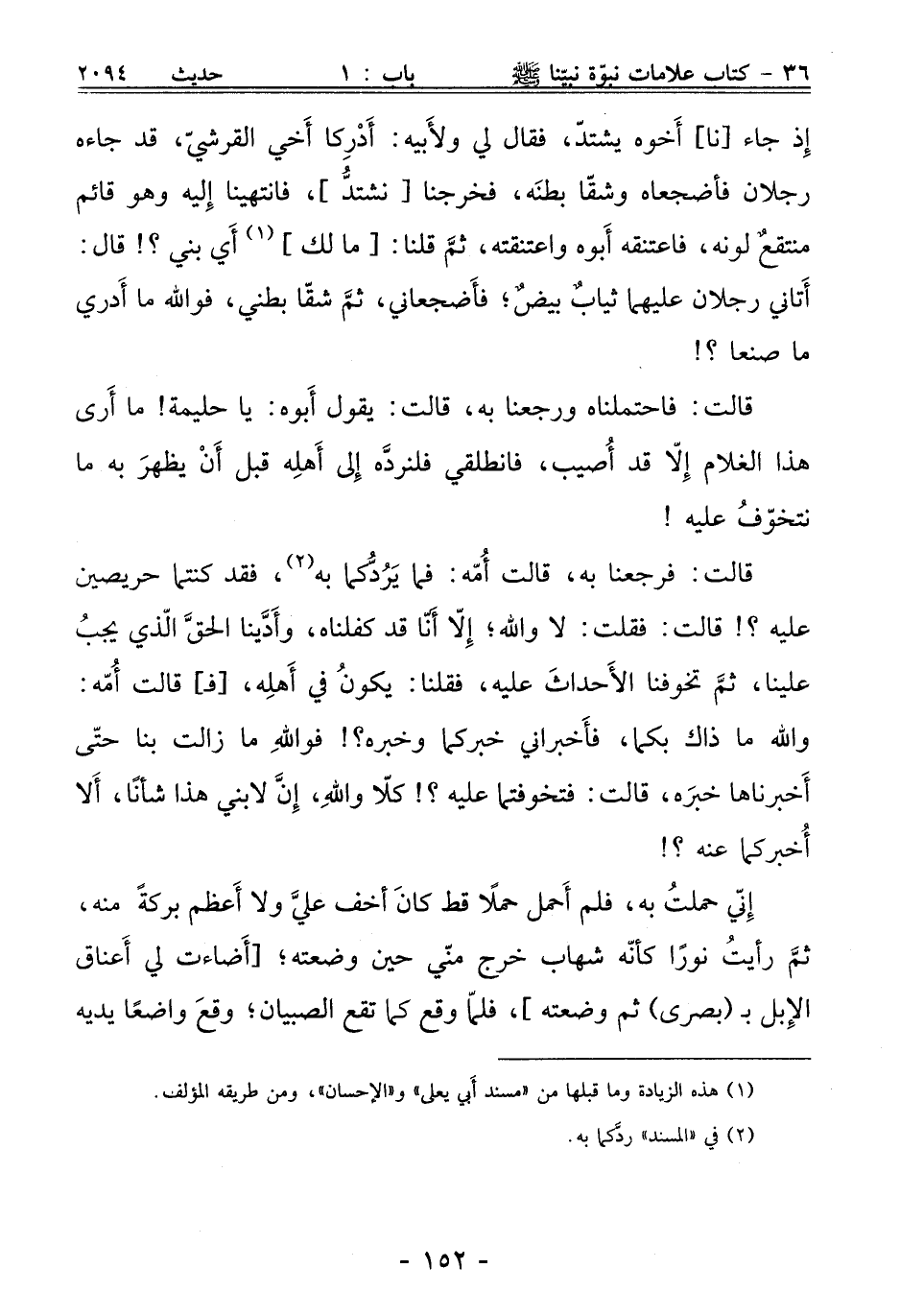 قالت: فرجعنا به، قالت أُمّه: فما يَرُدُّكما به (¬2)، فقد كنتما حريصين عليه؟! قالت: فقلت: لا والله؛ إِلّا أَنّا قد كفلناه، وأَدَّينا الحقَّ الّذي يجبُ علينا، ثمَّ تخوفنا الأَحداثَ عليه، فقلنا: يكونُ في أَهلِه، [فـ] قالت أُمّه: والله ما ذاك بكما، فأَخبراني خبركما وخبره؟! فواللهِ ما زالت بنا حتّى أَخبرناها خبَره، قالت: فتخوفتما عليه؟! كلّا واللهِ، إِنَّ لابني هذا شأنًا، أَلا أُخبركما عنه؟!