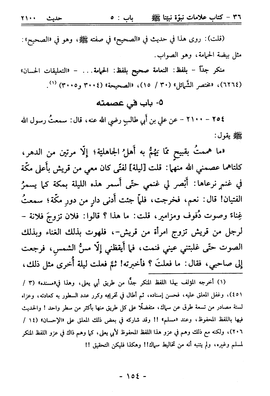 "ما هممتُ بقبيحٍ ممّا يَهُمُّ به أَهلُ الجاهليّة؛ إلّا مرتين من الدهر، كلتاهما عصمني الله منهما: قلت [ليلة] لفتًى كان معي من قريش بأَعلى مكّة في غنمٍ نرعاها: أَبْصر لي غنمي حتّى أَسمر هذه الليلة بمكة كما يسمرُ الفتيان! قال: نعم، فخرجت، فلمّا جئت أَدنى دارٍ من دورِ مكّة؛ سمعتُ غِناءً وصوت دُفوف ومزامير، قلت: ما هذا؟ قالوا: فلان تزوجَ فلانة - لرجل من قريش تزوج امرأة من قريش -، فلهوت بذلك الغناء وبذلك الصوت حتّى غلبتني عيني فنمت، فما أَيقظني إلّا مسُّ الشمسِ، فرجعت إلى صاحبي، فقال: ما فعلتَ؟ فأخبرته! ثمَّ فعلت ليلة أُخرى مثل ذلك،
