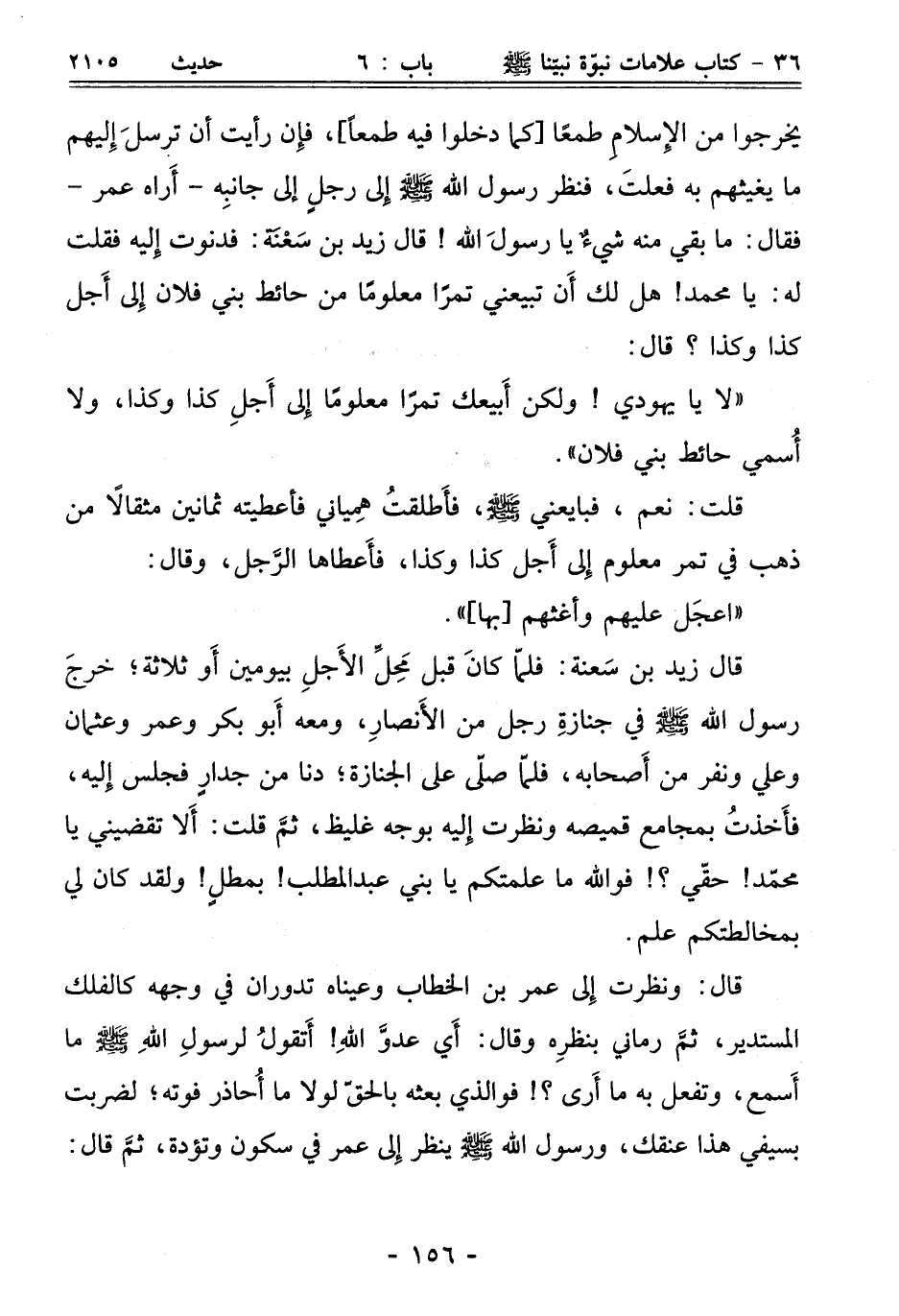 يخرجوا من الإِسلامِ طمعًا [كما دخلوا فيه طمعًا]، فإِن رأيت أن ترسلَ إِليهم ما يغيثهم به فعلتَ، فنظر رسول الله - صلى الله عليه وسلم - إلى رجلٍ إلى جانبِه - أَراه عمر - فقال: ما بقي منه شيءٌ يا رسولَ الله! قال زيد بن سَعْنَة: فدنوت إليه فقلت له: يا محمد! هل لك أَن تبيعني تمرًا معلومًا من حائط بني فلان إِلى أَجل كذا وكذا؟ قال: