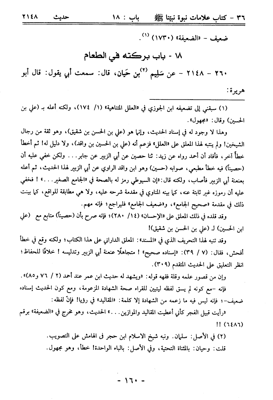 وهذا لا وجود له في إسناد الحديث، وإنما هو (علي بن الحسن بن شقيق)، وهو ثقة من رجال الشيخين! ولم ينتبه لهذا المعلق على "العلل" فزعم أنه (علي بن الحسين بن واقد)، ولا دليل له! ثم أخطأ خطأً آخر، فأفاد أن أحمد رواه عن زيد: ثنا حصين عن أبي الزبير عن جابر ... ولكن خفي عليه أن (حصينًا) فيه خطأ مطبعي، صوابه (حسين) وهو ابن واقد الراوي عن أبي الزبير لهذا الحديث، ثم أعله بعنعنة أبي الزبير فأصاب، ولكنه قال: "إن السيوطي رمز له بالصحة في "الجامع الصغير ... "! فخفي عليه أن رموزه غير ثابتة عنه، كما بينه المناوي في مقدمة شرحه عليه، ولا هي مطابقة للواقع، كما بينت ذلك في مقدمة "صحيح الجامع"، و"ضعيف الجامع" فليراجع؛ فإنه مهم.