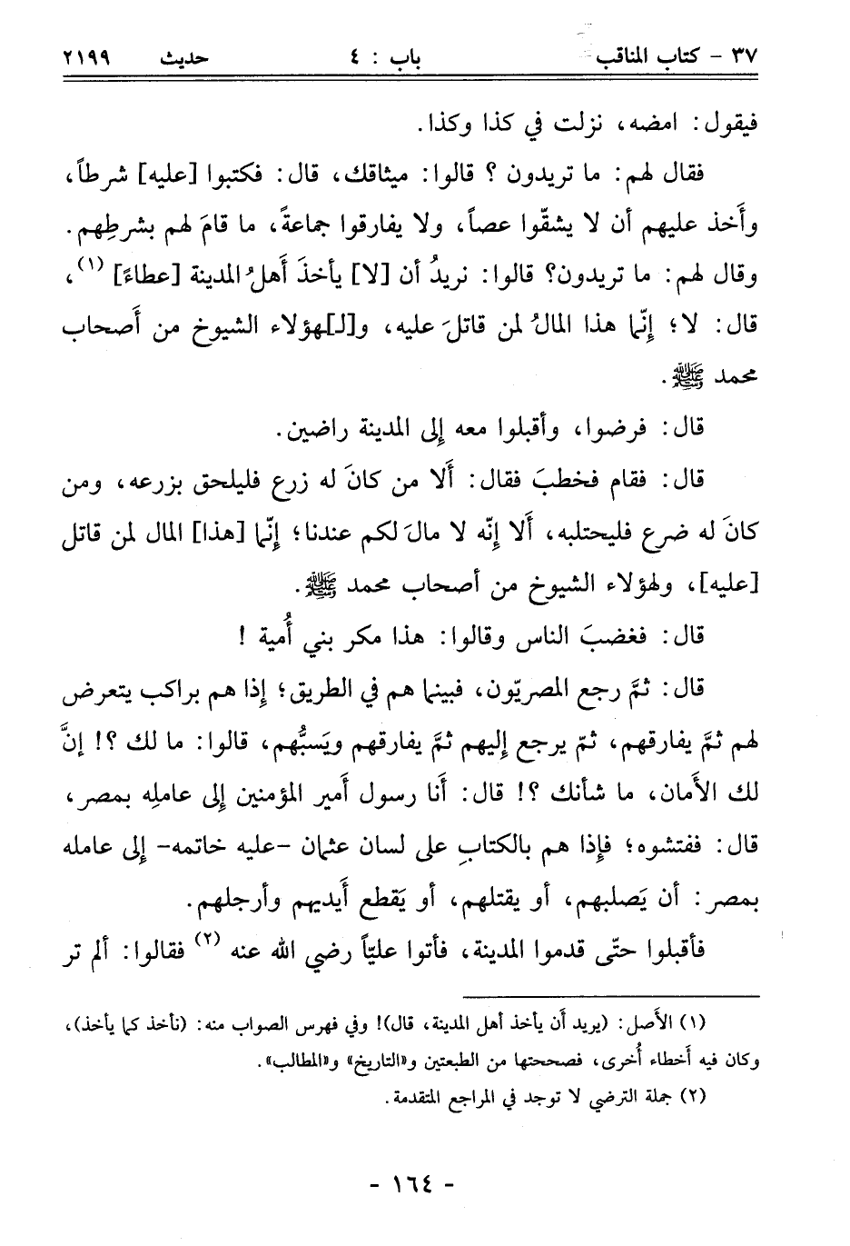 فقال لهم: ما تريدون؟ قالوا: ميثاقك، قال: فكتبوا [عليه] شرطًا، وأَخذ عليهم أن لا يشقّوا عصًا، ولا يفارقوا جماعةً، ما قامَ لهم بشرطِهم. وقال لهم: ما تريدون؟ قالوا: نريدُ أن [لا] يأخذَ أَهلُ المدينة [عطاءً] (¬1)، قال: لا؛ إِنّما هذا المالُ لمن قاتلَ عليه، و [لـ]ـهؤلاء الشيوخ من أَصحاب محمد - صلى الله عليه وسلم -.