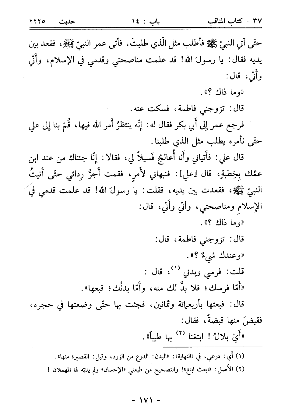 قال علي: فأَتياني وأَنا أُعالجُ فَسيلًا لي، فقالا: إِنّا جئناك من عند ابن عمِّك بِخِطبةٍ، قال [علي]: فنبهاني لأَمرٍ، فقمت أَجرُّ رِدائي حتّى أَتيتُ النبيّ - صلى الله عليه وسلم -، فقعدت بين يديه، فقلت: يا رسولَ الله! قد علمت قدمي في الإِسلامِ ومناصحتي، وأنّي وأَنّي، قال: