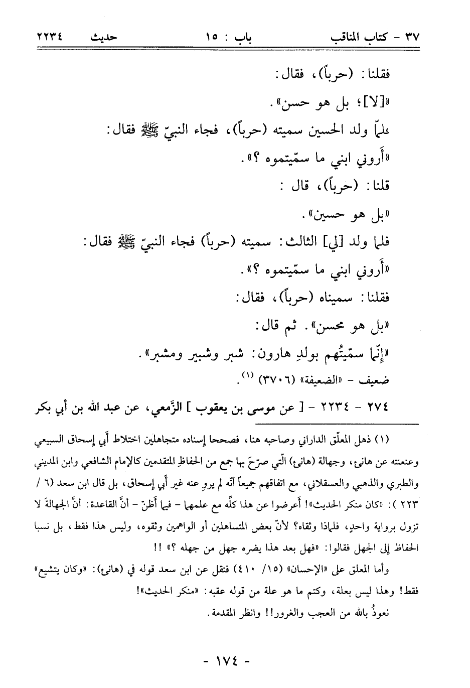 (¬1) ذهل المعلّق الداراني وصاحبه هنا، فصححا إسناده متجاهلين اختلاط أَبي اسحاق السبيعي وعنعنته عن هانئ, وجهالة (هانئ) الّتي صرّحَ بها جمع من الحفاظِ المتقدمين كالإمام الشافعي وابن المديني والطبري والذهبي والعسقلاني، مع اتفاقهم جميعًا أنّه لم يروِ عنه غير أَبي إِسحاق، بل قال ابن سعد (6/ 223): "كان منكر الحديث"! أَعرضوا عن هذا كلِّه مع علمهما - فيما أَظنّ - أنَّ القاعدة: أنَّ الجهالةَ لا تزول برواية واحدٍ، فلماذا وثقاه؟ لأنّ بعض المتساهلين أو الواهمين وثقوه، وليس هذا فقط، بل نسبا الحفاظ إِلى الجهل فقالوا: "فهل بعد هذا يضره جهل من جهله؟ "!!