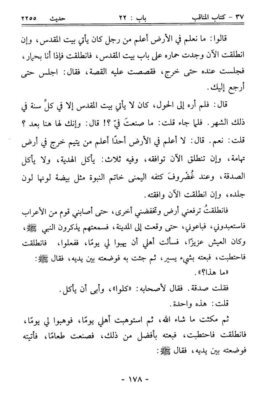 قال: فلم أره إلى الحول، كان لا يأتي بيت المقدس إلا في كلِّ سنة في ذلك الشهر. فلما جاء قلت: ما صنعتَ فيّ؟! قال: وإنك لها هنا بعد؟ قلت: نعم. قال: لا أعلم في الأرض أحدًا أعلم من يتيم خرج في أرض تهامة، وإن تنطلق الآن توافقه، وفيه ثلاث: يأكل الهدية، ولا يأكل الصدقة، وعند غُضْروفَ كتفه اليمنى خاتم النبوة مثل بيضة لونها لون جلده، وإن انطلقت الآن وافقته.