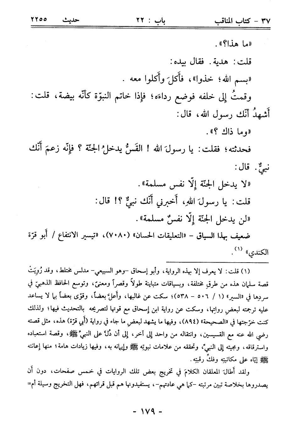 فحدثته؛ فقلت: يا رسولَ الله! القَسُّ يدخلُ الجنّة؟ فإِنّه زعمَ أَنّك نبيٌّ. قال:
