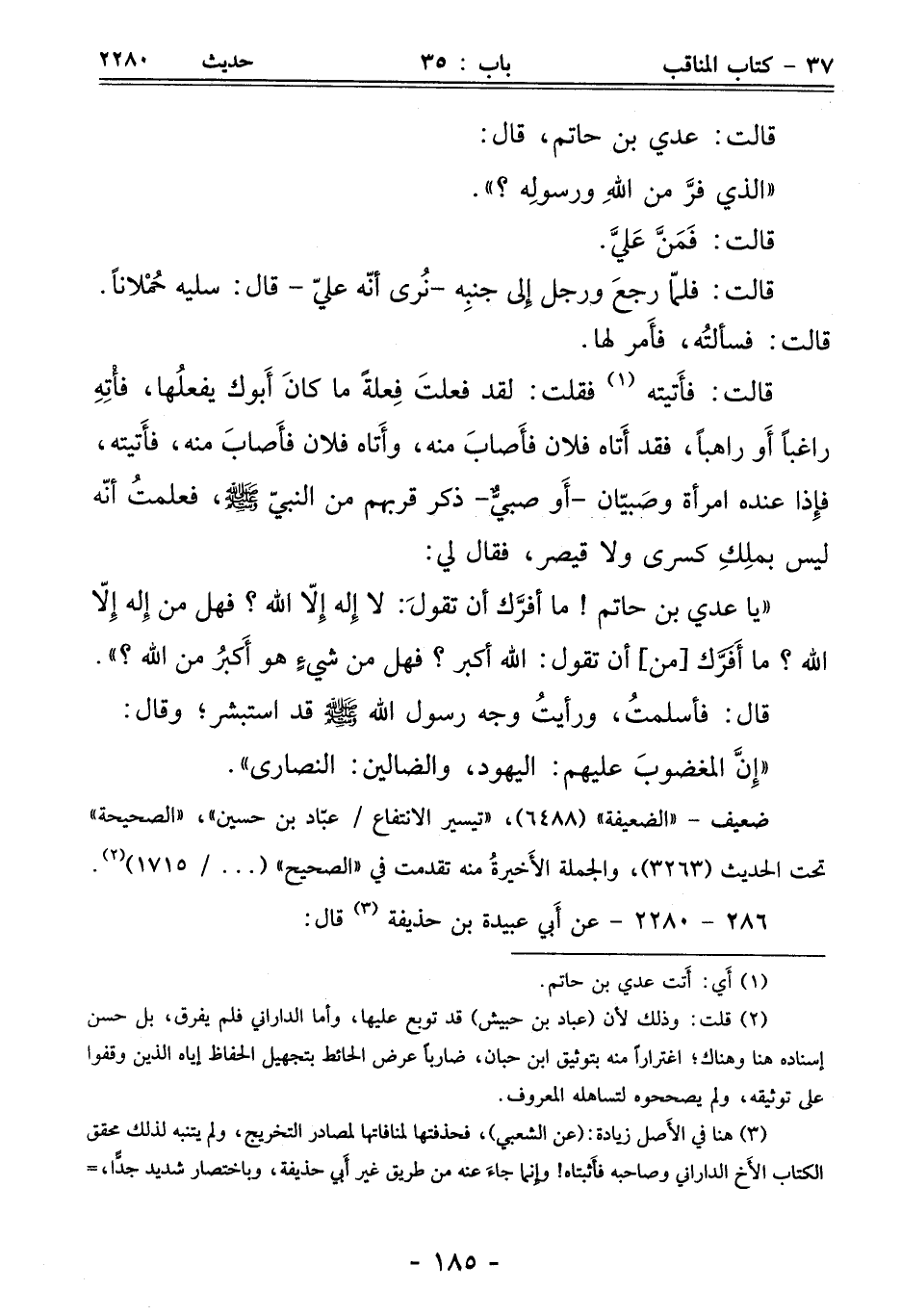 "يا عدي بن حاتم! ما أفرَّك أن تقولَ: لا إِله إِلّا الله؟ فهل من إِله إِلّا الله؟ ما أَفَرَّك [من] أن تقول: الله أكبر؟ فهل من شيءٍ هو أَكبُر من الله؟ ".