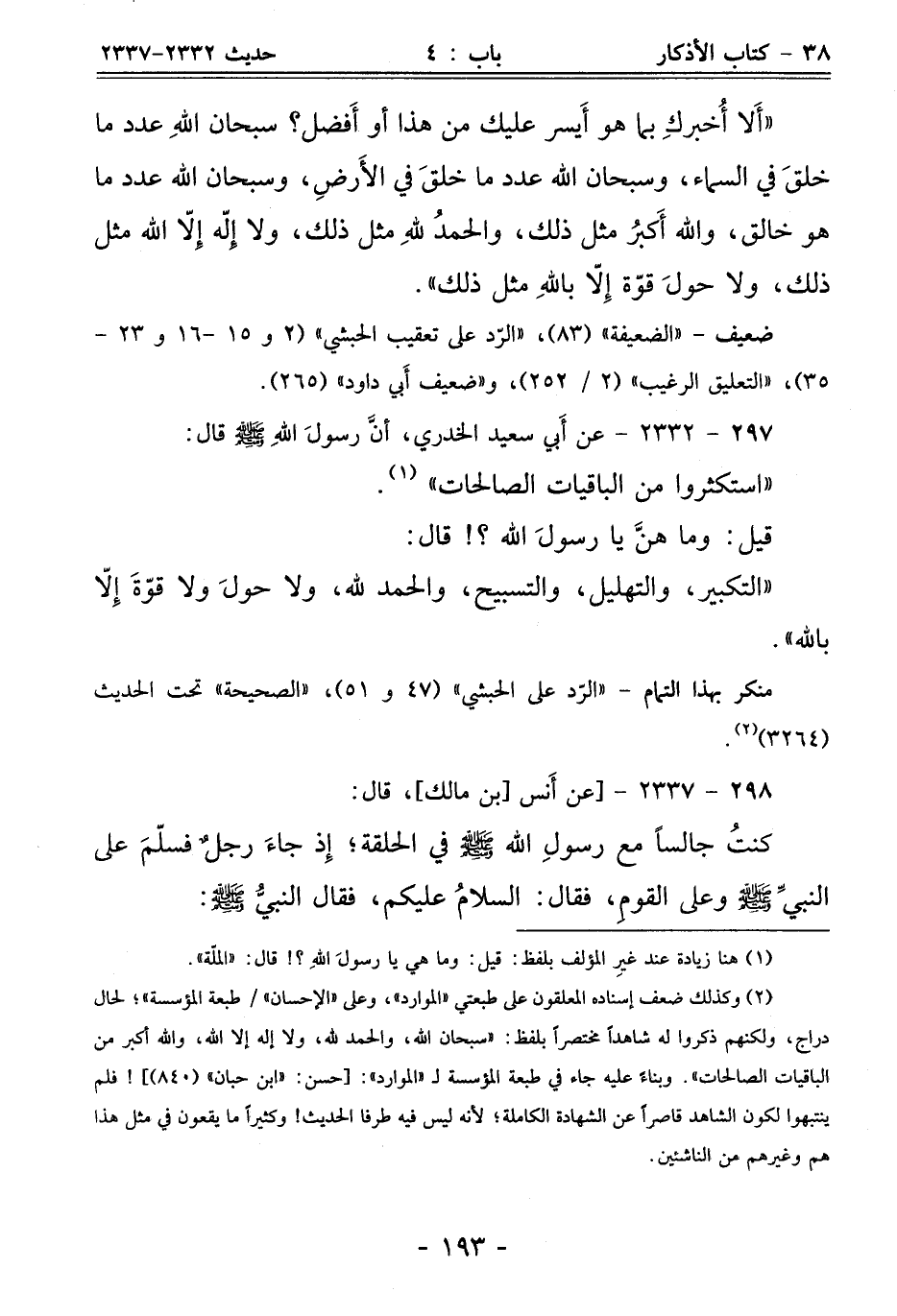 (¬2) وكذلك ضعف إسناده المعلقون على طبعتي "الموارد"، وعلى "الإحسان"/ طبعة المؤسسة"؛ لحال دراج، ولكنهم ذكروا له شاهدًا مختصرًا بلفظ: "سبحان الله، والحمد لله، ولا إله إلا الله، والله أكبر من الباقيات الصالحات". وبناءً عليه جاء في طبعة المؤسسة لـ "الموارد": [حسن: "ابن حبان" (840)]! فلم ينتبهوا لكون الشاهد قاصرًا عن الشهادة الكاملة؛ لأنه ليس فيه طرفا الحديث! وكثيرًا ما يقعون في مثل هذا هم وغيرهم من الناشئين.