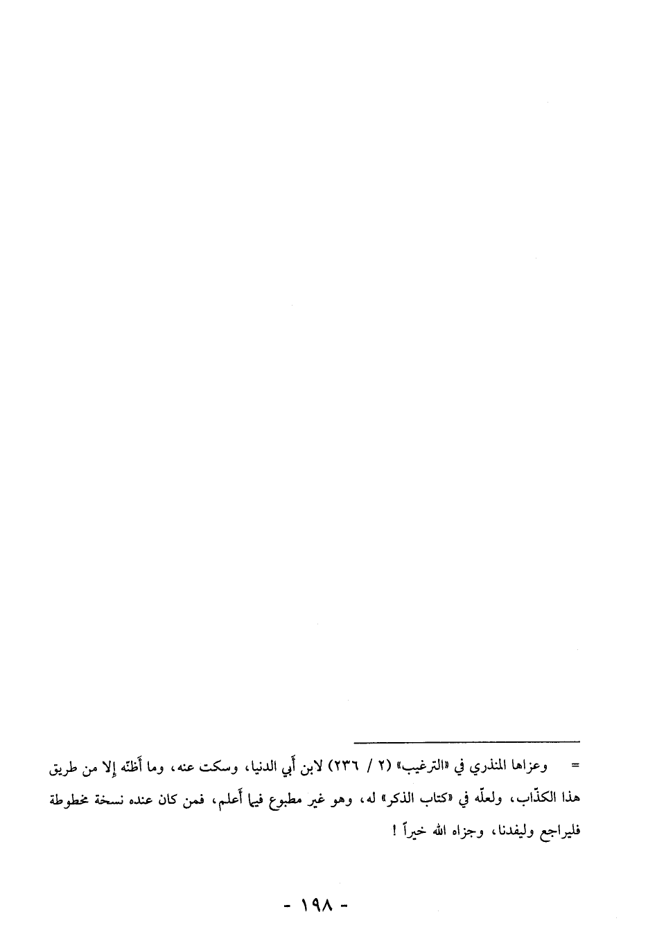 = وعزاها المنذري في "الترغيب" (2/ 236) لابن أَبي الدنيا، وسكت عنه، وما أَظنّه إِلا من طريق هذا الكذّاب، ولعلّه في "كتاب الذكر" له، وهو غير مطبوع فيما أَعلم، فمن كان عنده نسخة مخطوطة فليراجع وليفدنا، وجزاه الله خيرًا!