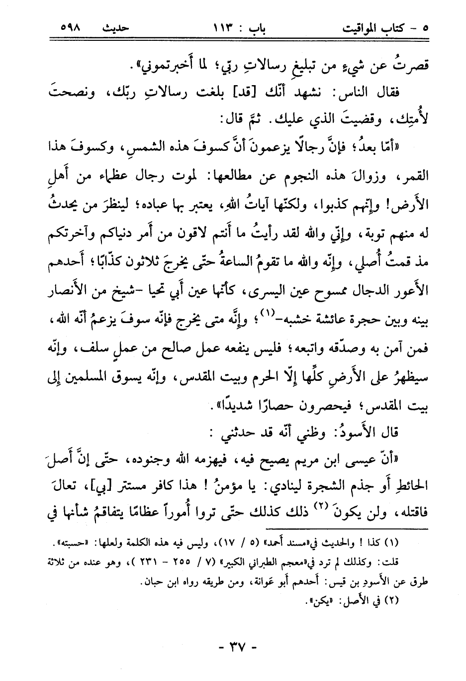 "أنّ عيسى ابن مريم يصيح فيه، فيهزمه الله وجنوده، حتّى إنَّ أَصلَ الحائطِ أَو جذم الشجرة لينادي: يا مؤمنُ! هذا كافر مستتر [بي]، تعالَ فاقتله، ولن يكونَ (¬2) ذلك كذلك حتّى تروا أُموراً عظامًا يتفاقمُ شأنها في