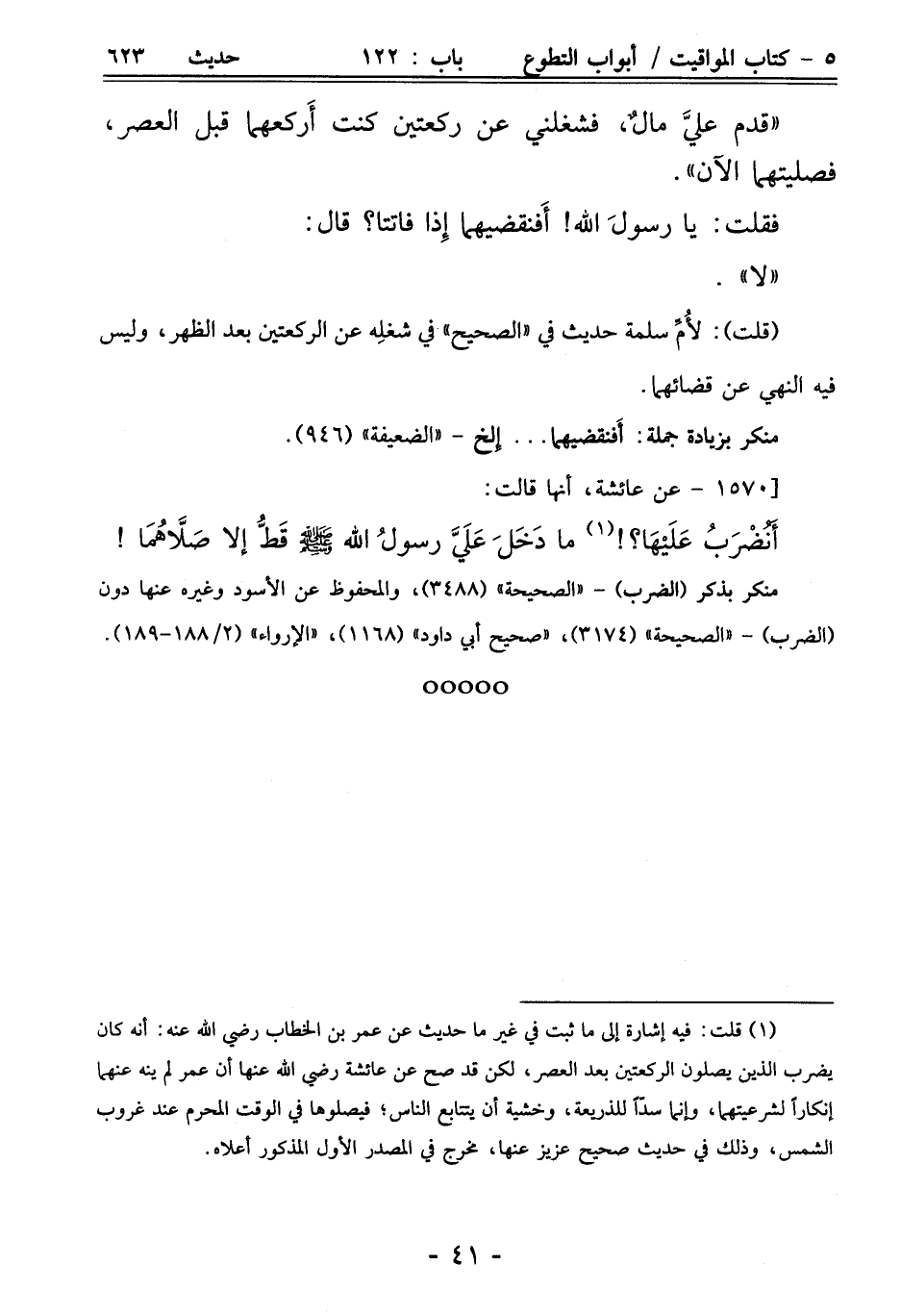(¬1) قلت: فيه إشارة إلى ما ثبت في غير ما حديث عن عمر بن الخطاب رضي الله عنه: أنه كان يضرب الذين يصلون الركعتين بعد العصر، لكن قد صح عن عائشة رضي الله عنها أن عمر لم ينه عنهما إنكاراً لشرعيتهما، وإنما سدّاً للذريعة، وخشية أن يتتابع الناس؛ فيصلوها في الوقت المحرم عند غروب الشمس، وذلك في حديث صحيح عزيز عنها، مخرج في المصدر الأول المذكور أعلاه.