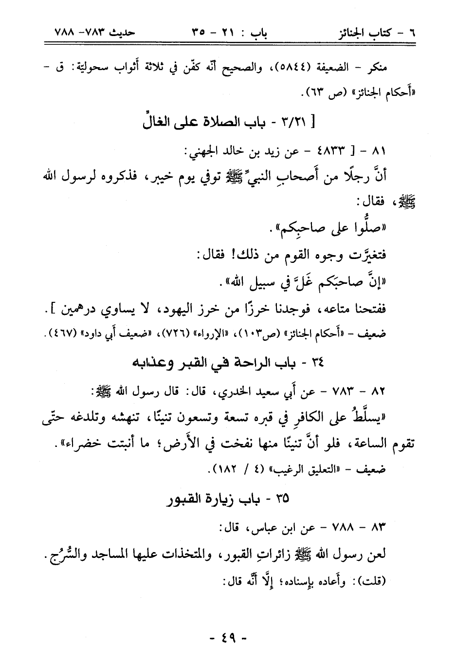 منكر - الضعيفة (5844)، والصحيح أنّه كفّن في ثلاثة أَثواب سحوليّة: ق - "أَحكام الجنائز" (ص 63).