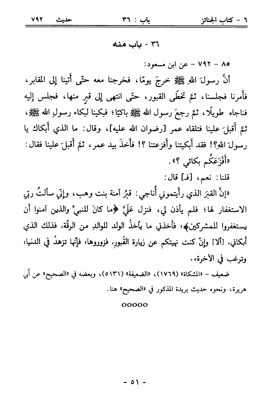 "إنَّ القبَر الذي رأَيتموني أُناجي: قبرُ آمنة بنت وهب، وإنّي سألتُ ربّي الاستغفار لها؛ فلم يأذن لي، فنزل عَلَيَّ {مَا كَانَ لِلنَّبِيِّ وَالَّذِينَ آمَنُوا أَنْ يَسْتَغْفِرُوا لِلْمُشْرِكِينَ}؛ فأَخذني ما يأخذُ الولد للوالد من الرقّة، فذلك الذي أَبكاني، [ألا] وإنّ كنت نهيتكم عن زيارة القُبورِ، فزوروها؛ فإِنَّها تزهدُ في الدنيا؛ وترغب في الآخرة".