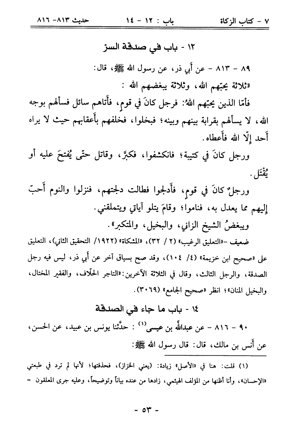 فأمّا الذين يحبّهم اللهُ: فرجل كانَ في قومٍ، فأَتاهم سائل فسألهم بوجه الله، لا يسألهم بقرابة بينهم وبينه؛ فبخلوا، فخلفهم بأَعقابهم حيث لا يراه أَحد إلّا الله فأَعطاه.