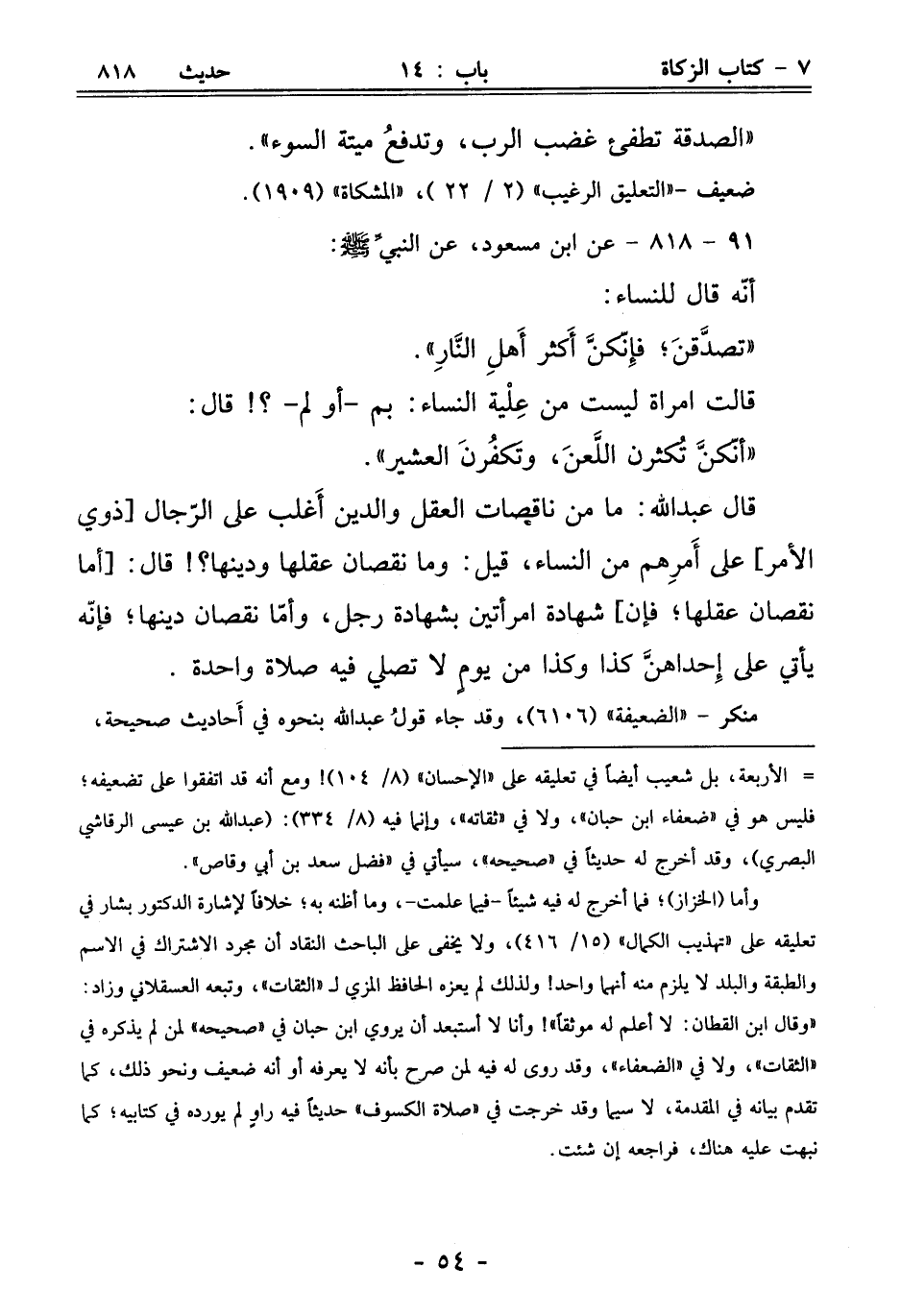 قال عبد الله: ما من ناقصات العقل والدين أَغلب على الرّجال [ذوي الأمر] على أَمرِهم من النساء، قيل: وما نقصان عقلها ودينها؟! قال: [أما نقصان عقلها؛ فإن] شهادة امرأتين بشهادة رجل، وأمّا نقصان دينها؛ فإنّه يأتي على إِحداهنَّ كذا وكذا من يومٍ لا تصلي فيه صلاة واحدة.