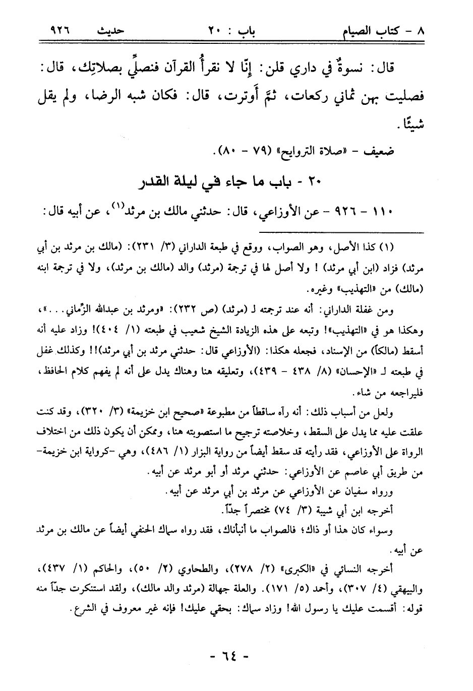 ومن غفلة الداراني: أنه عند ترجمته لـ (مرثد) (ص 232): "ومرثد بن عبد الله الزِّماني ... "، وهكذا هو في "التهذيب"! وتبعه على هذه الزيادة الشيخ شعيب في طبعته (1/ 404)! وزاد عليه أنه أسقط (مالكًا) من الإسناد، فجعله هكذا: (الأوزاعي قال: حدثني مرثد بن أبي مرثد)!! وكذلك غفل في طبعته لـ "الإحسان" (8/ 438 - 439)، وتعليقه هنا وهناك يدل على أنه لم يفهم كلام الحافظ، فليراجعه من شاء.