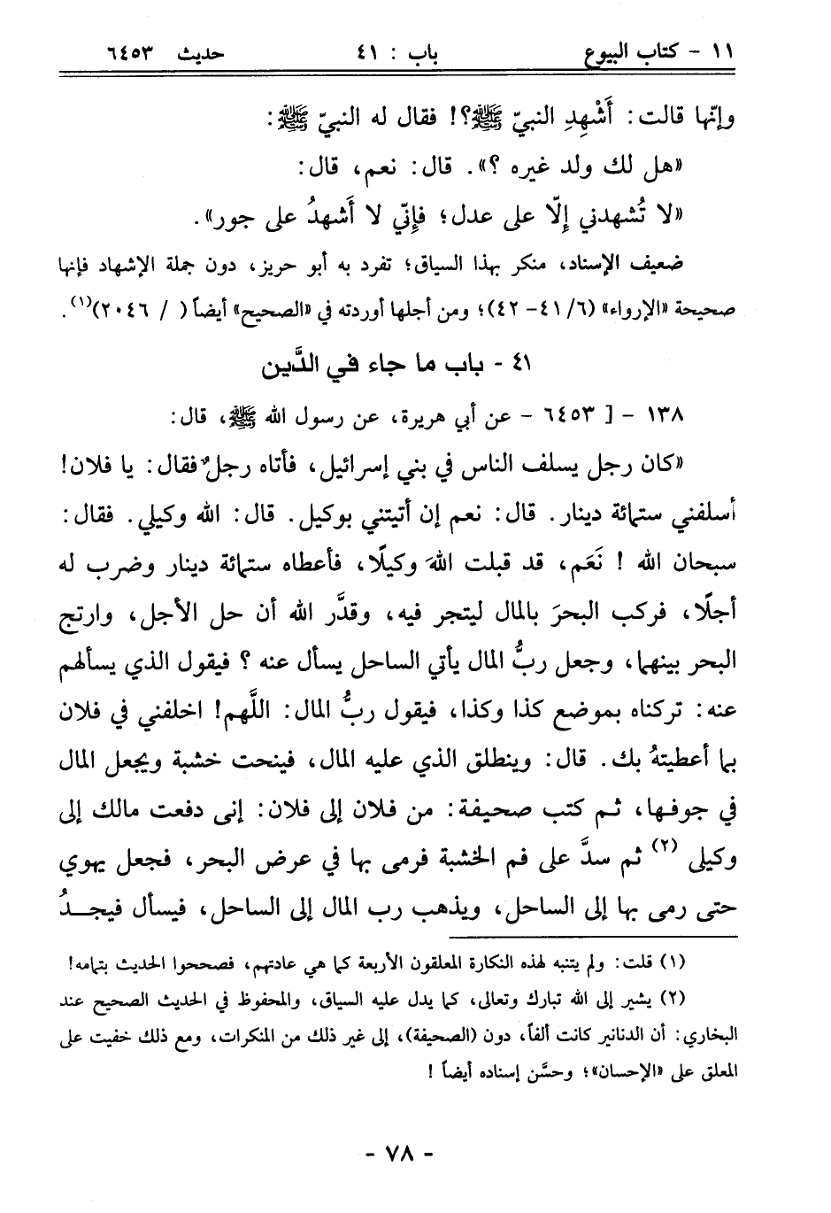 "كان رجل يسلف الناس في بني إسرائيل، فأتاه رجلٌ فقال: يا فلان! أسلفني ستمائة دينار. قال: نعم إن أتيتني بوكيل. قال: اللَّه وكيلي. فقال: سبحان اللَّه! نَعَم، قد قبلت اللَّهَ وكيلًا، فأعطاه ستمائة دينار وضرب له أجلًا، فركب البحرَ بالمال ليتجر فيه، وقدَّر الله أن حل الأجل، وارتج البحر بينهما، وجعل ربُّ المال يأتي الساحل يسأل عنه؟ فيقول الذي يسألهم عنه: تركناه بموضع كذا وكذا، فيقول ربُّ المال: اللَّهم! اخلفني في فلان بما أعطيتهُ بك. قال: وينطلق الذي عليه المال، فينحت خشبة ويجعل المال في جوفها، ثم كتب صحيفة: من فلان إلى فلان: إنى دفعت مالك إلى وكيلي (¬2) ثم سدَّ على فم الخشبة فرمى بها في عرض البحر، فجعل يهوي حتى رمى بها إلى الساحل، ويذهب رب المال إلى الساحل، فيسأل فيجدُ