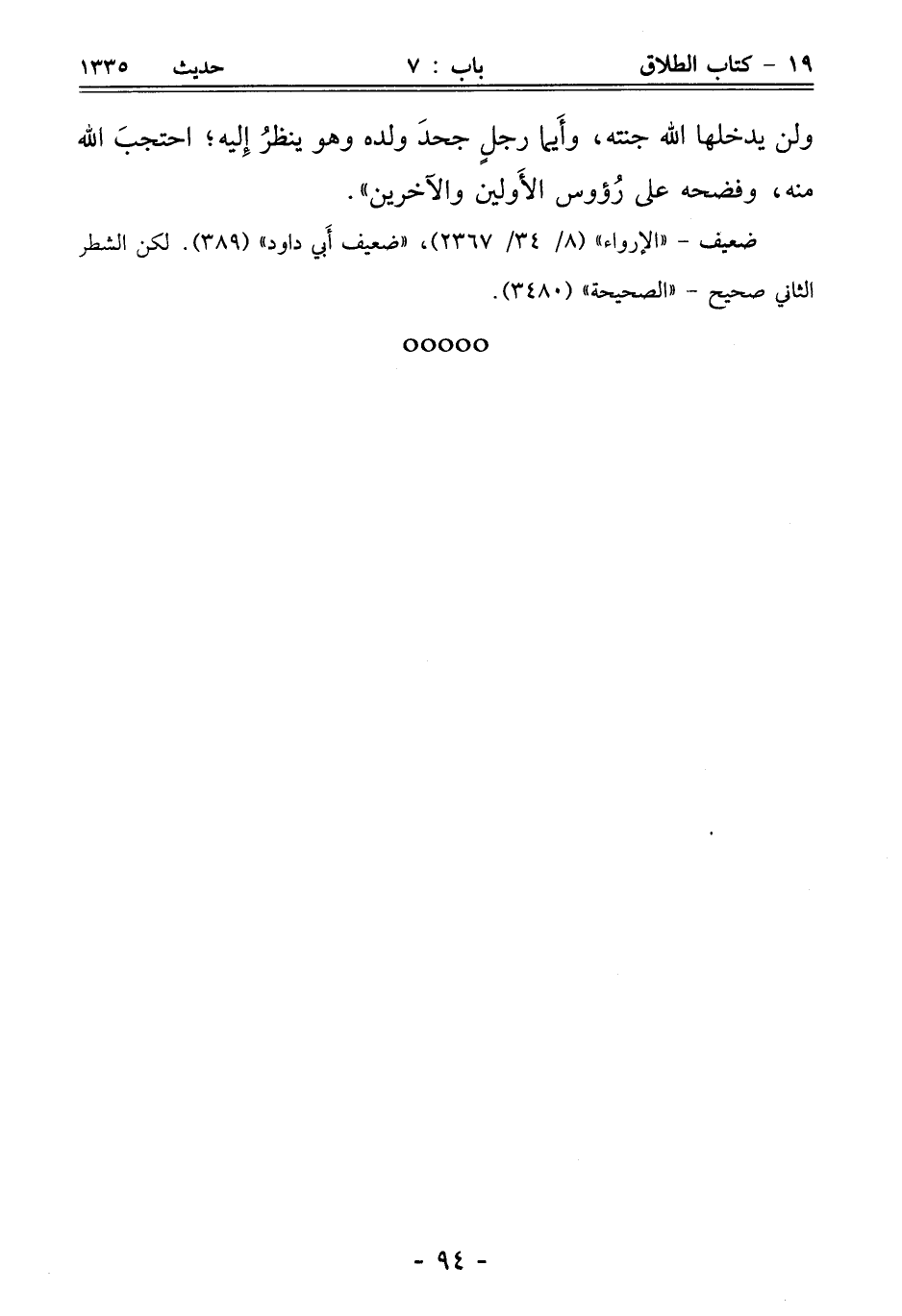 ولن يدخلها الله جنته، وأَيما رجلٍ جحدَ ولده وهو ينظرُ إِليه؛ احتجبَ الله منه، وفضحه على رُؤوس الأَولين والآخرين".