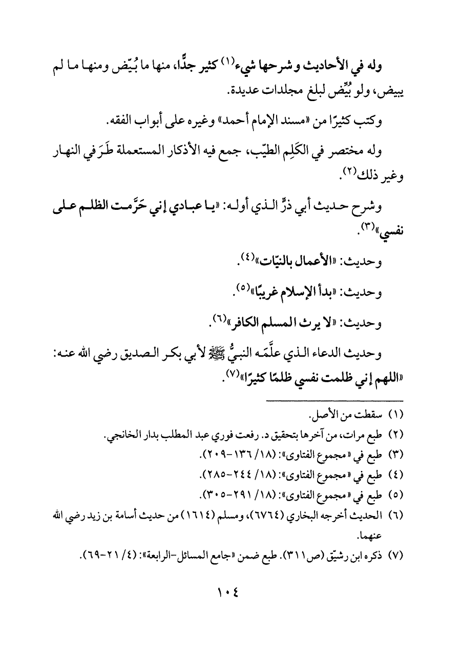 وشرح حديث أبي ذرٍّ الذي أوله: «يا عبادي إني حَرَّمت الظلم على نفسي» (¬٣).