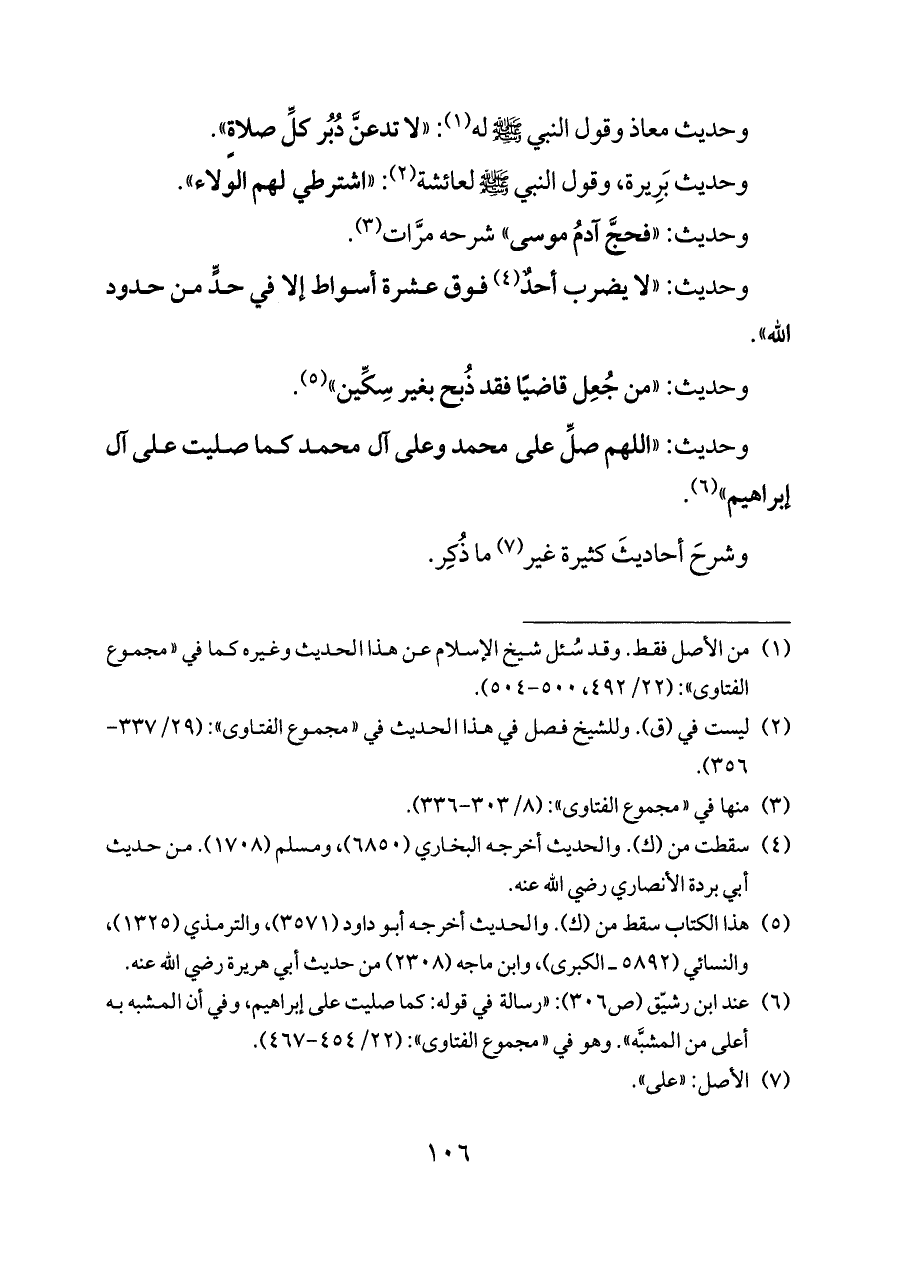 (¬٦) عند ابن رشيّق (ص ٣٠٦): «رسالة في قوله: كما صليت على إبراهيم، وفي أن المشبه به أعلى من المشبَّه». وهو في «مجموع الفتاوى»: (٢٢/ ٤٥٤ - ٤٦٧).
