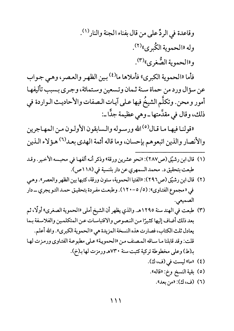 (¬٣) طبعت في الهند سنة ١٢٩٥ هـ. والذي يظهر أن الشيخ أملى «الحموية الصغرى» أولًا، ثم بعد ذلك أضاف إليها كثيرًا من النصوص والاقتباسات عن المتكلمين والفلاسفة بما يعادل ثلث الكتاب، فصارت هذه النسخة المزيدة هي «الحموية الكبرى». والله أعلم.