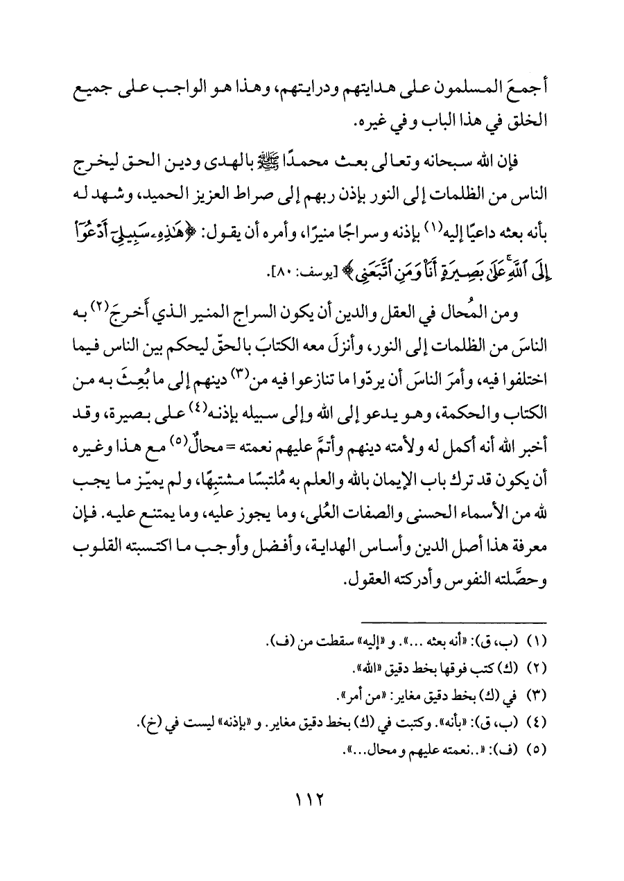 ومن المُحال في العقل والدين أن يكون السراج المنير الذي أَخرجَ (¬٢) به الناسَ من الظلمات إلى النور، وأنزلَ معه الكتابَ بالحقّ ليحكم بين الناس فيما اختلفوا فيه، وأمرَ الناسَ أن يردّوا ما تنازعوا فيه من (¬٣) دينهم إلى ما بُعِثَ به من الكتاب والحكمة، وهو يدعو إلى الله وإلى سبيله بإذنه (¬٤) على بصيرة، وقد أخبر الله أنه أكمل له ولأمته دينهم وأتمَّ عليهم نعمته =محالٌ (¬٥) مع هذا وغيره أن يكون قد ترك باب الإيمان بالله والعلم به مُلتبسًا مشتبِهًا، ولم يميّز ما يجب لله من الأسماء الحسنى والصفات العُلى، وما يجوز عليه، وما يمتنع عليه. فإن معرفة هذا أصل الدين وأساس الهداية، وأفضل وأوجب ما اكتسبته القلوب وحصَّلته النفوس وأدركته العقول.