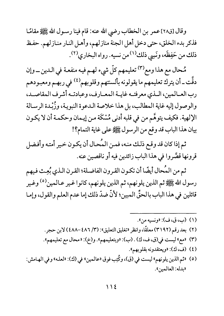 ثم من المُحال أيضًا أن تكون القرون الفاضلة؛ القرن الذي بُعِث فيهم رسول الله - صلى الله عليه وسلم - ثم الذين يلونهم، ثم الذين يلونهم، كانوا غير عالمين (¬٥) وغير قائلين في هذا الباب بالحقِّ المبين؛ لأنّ ضدّ ذلك إما عدم العلم والقول، وإما