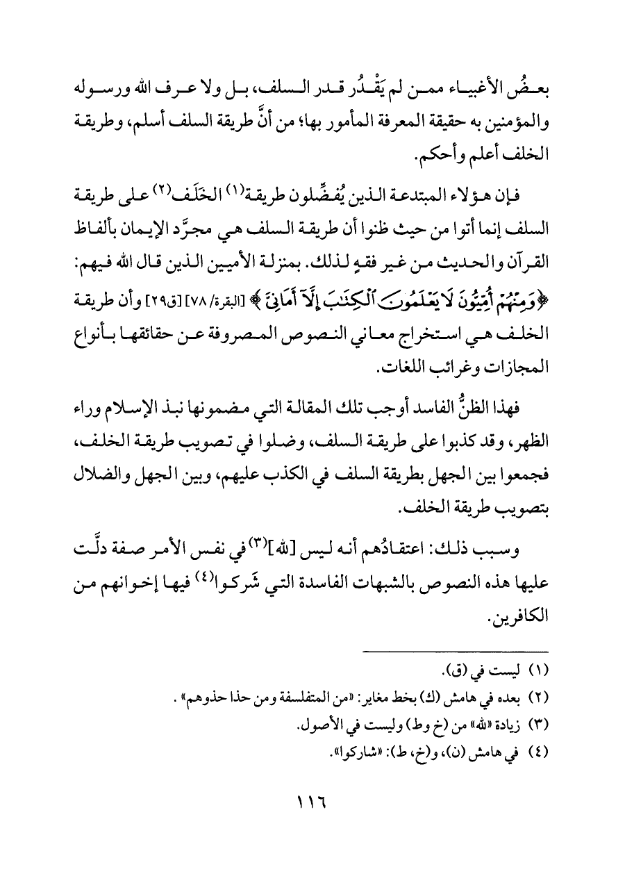 فإن هؤلاء المبتدعة الذين يُفضِّلون طريقة (¬١) الخَلَف (¬٢) على طريقة السلف إنما أتوا من حيث ظنوا أن طريقة السلف هي مجرَّد الإيمان بألفاظ القرآن والحديث من غير فقهٍ لذلك. بمنزلة الأميين الذين قال الله فيهم: {وَمِنْهُمْ أُمِّيُّونَ لَا يَعْلَمُونَ الْكِتَابَ إِلَّا أَمَانِيَّ} [البقرة/٧٨] [ق ٢٩] وأن طريقة الخلف هي استخراج معاني النصوص المصروفة عن حقائقها بأنواع المجازات وغرائب اللغات.