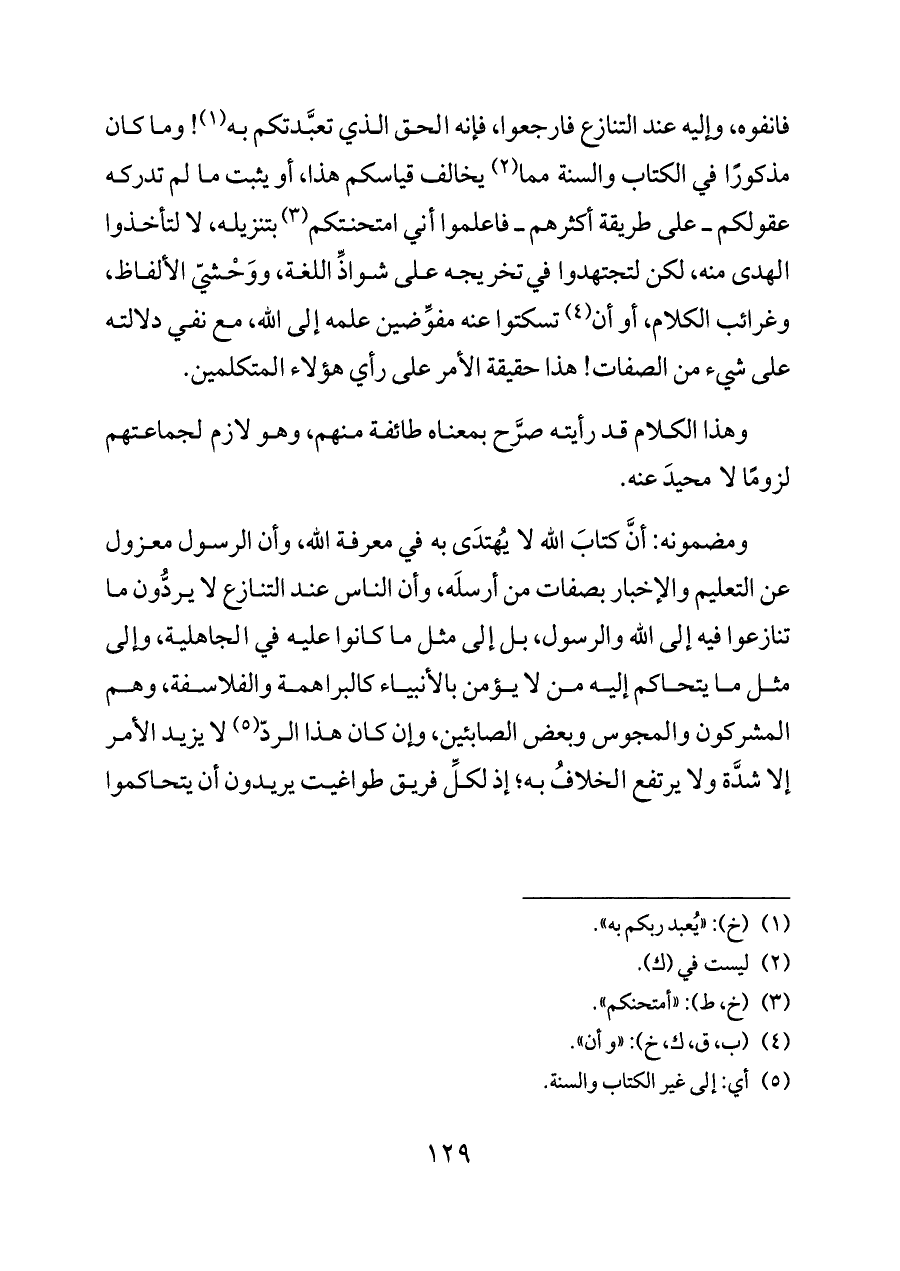 فانفوه، وإليه عند التنازع فارجعوا، فإنه الحق الذي تعبَّدتكم به (¬١)! وما كان مذكورًا في الكتاب والسنة مما (¬٢) يخالف قياسكم هذا، أو يثبت ما لم تدركه عقولكم ــ على طريقة أكثرهم ــ فاعلموا أني امتحنتكم (¬٣) بتنزيله، لا لتأخذوا الهدى منه، لكن لتجتهدوا في تخريجه على شواذِّ اللغة، ووَحْشيّ الألفاظ، وغرائب الكلام، أو أن (¬٤) تسكتوا عنه مفوِّضين علمه إلى الله، مع نفي دلالته على شيء من الصفات! هذا حقيقة الأمر على رأي هؤلاء المتكلمين.