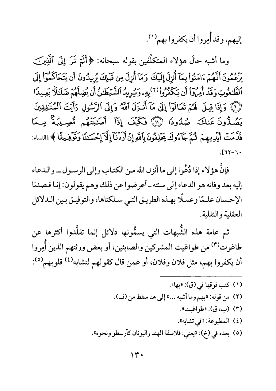 ثم عامة هذه الشُّبهات التي يسمُّونها دلائل إنما تقلَّدوا أكثرها عن طاغوت (¬٣) من طواغيت المشركين والصابئين، أو بعض ورثتهم الذين أُمِروا أن يكفروا بهم، مثل فلان وفلان، أو عمن قال كقولهم لتشابه (¬٤) قلوبهم (¬٥):