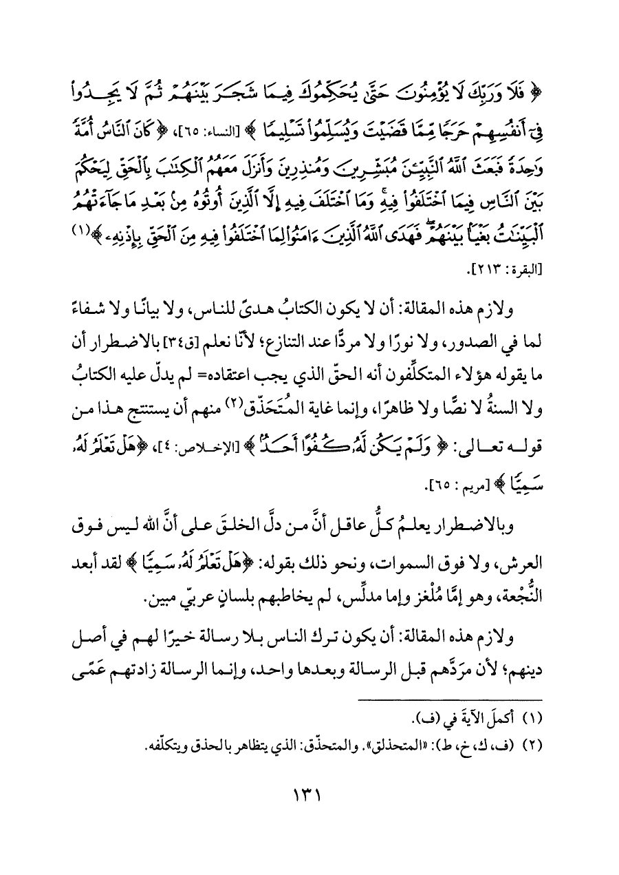 ولازم هذه المقالة: أن لا يكون الكتابُ هدىً للناس، ولا بيانًا ولا شفاءً لما في الصدور، ولا نورًا ولا مردًّا عند التنازع؛ لأنّا نعلم [ق ٣٤] بالاضطرار أن ما يقوله هؤلاء المتكلِّفون أنه الحقّ الذي يجب اعتقاده= لم يدلّ عليه الكتابُ ولا السنةُ لا نصًّا ولا ظاهرًا، وإنما غاية المُتَحَذّق (¬٢) منهم أن يستنتج هذا من قوله تعالى: {وَلَمْ يَكُنْ لَهُ كُفُوًا أَحَدٌ} [الإخلاص: ٤]، {هَلْ تَعْلَمُ لَهُ سَمِيًّا} [مريم: ٦٥].
