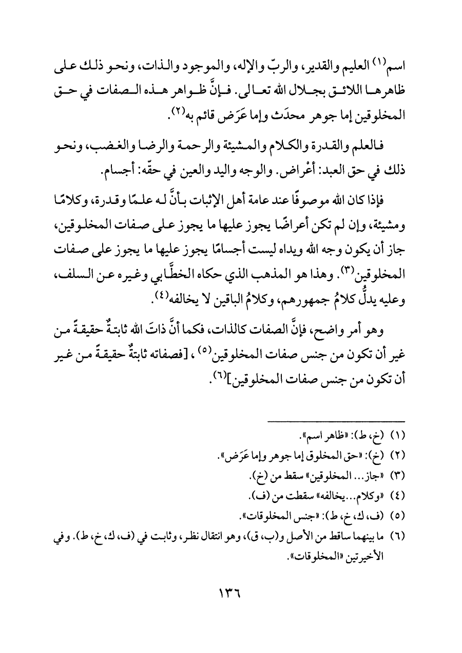 فإذا كان الله موصوفًا عند عامة أهل الإثبات بأنَّ له علمًا وقدرة، وكلامًا ومشيئة، وإن لم تكن أعراضًا يجوز عليها ما يجوز على صفات المخلوقين، جاز أن يكون وجه الله ويداه ليست أجسامًا يجوز عليها ما يجوز على صفات المخلوقين (¬٣). وهذا هو المذهب الذي حكاه الخطَّابي وغيره عن السلف، وعليه يدلُّ كلامُ جمهورهم، وكلامُ الباقين لا يخالفه (¬٤).