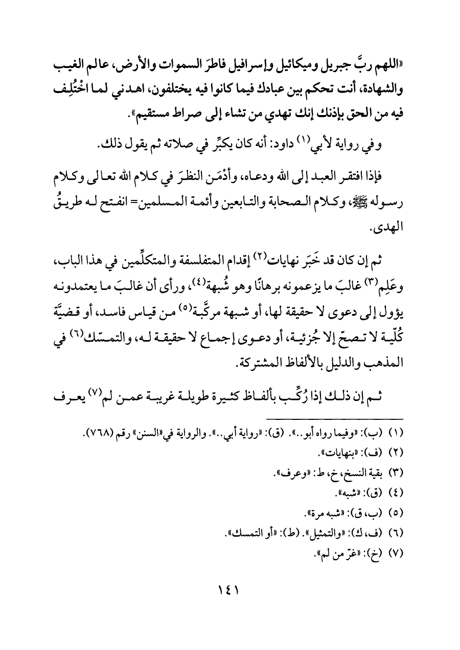 «اللهم ربَّ جبريل وميكائيل وإسرافيل فاطرَ السموات والأرض، عالم الغيب والشهادة، أنت تحكم بين عبادك فيما كانوا فيه يختلفون، اهدني لما اخْتُلِف فيه من الحق بإذنك إنك تهدي من تشاء إلى صراط مستقيم».
