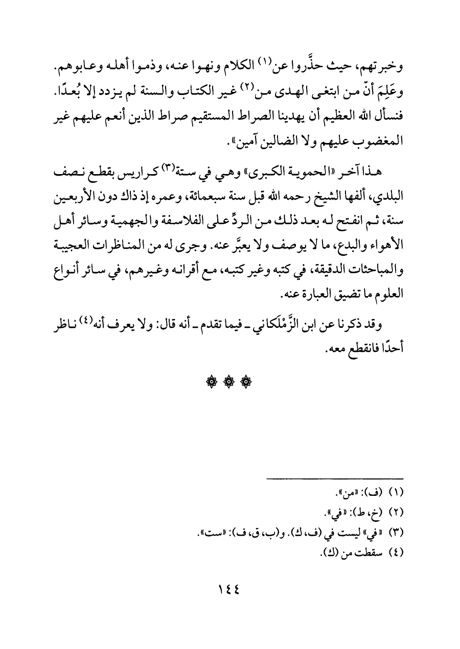وخبرتهم، حيث حذَّروا عن (¬١) الكلام ونهوا عنه، وذموا أهله وعابوهم. وعَلِمَ أنّ من ابتغى الهدى من (¬٢) غير الكتاب والسنة لم يزدد إلا بُعدًا. فنسأل الله العظيم أن يهدينا الصراط المستقيم صراط الذين أنعم عليهم غير المغضوب عليهم ولا الضالين آمين».