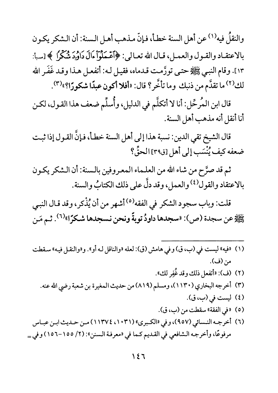 والنقلُ فيه (¬١) عن أهل السنة خطأ، فإنّ مذهب أهل السنة: أن الشكر يكون بالاعتقاد والقول والعمل، قال الله تعالى: {اعْمَلُوا آلَ دَاوُودَ شُكْرًا} [سبأ: ١٣]. وقام النبي - صلى الله عليه وسلم - حتى تورَّمت قدماه، فقيل له: أتفعل هذا وقد غَفَر الله لك (¬٢) ما تقدَّم من ذنبك وما تأخَّر؟ قال: «أفلا أكون عبدًا شكورًا؟ » (¬٣).