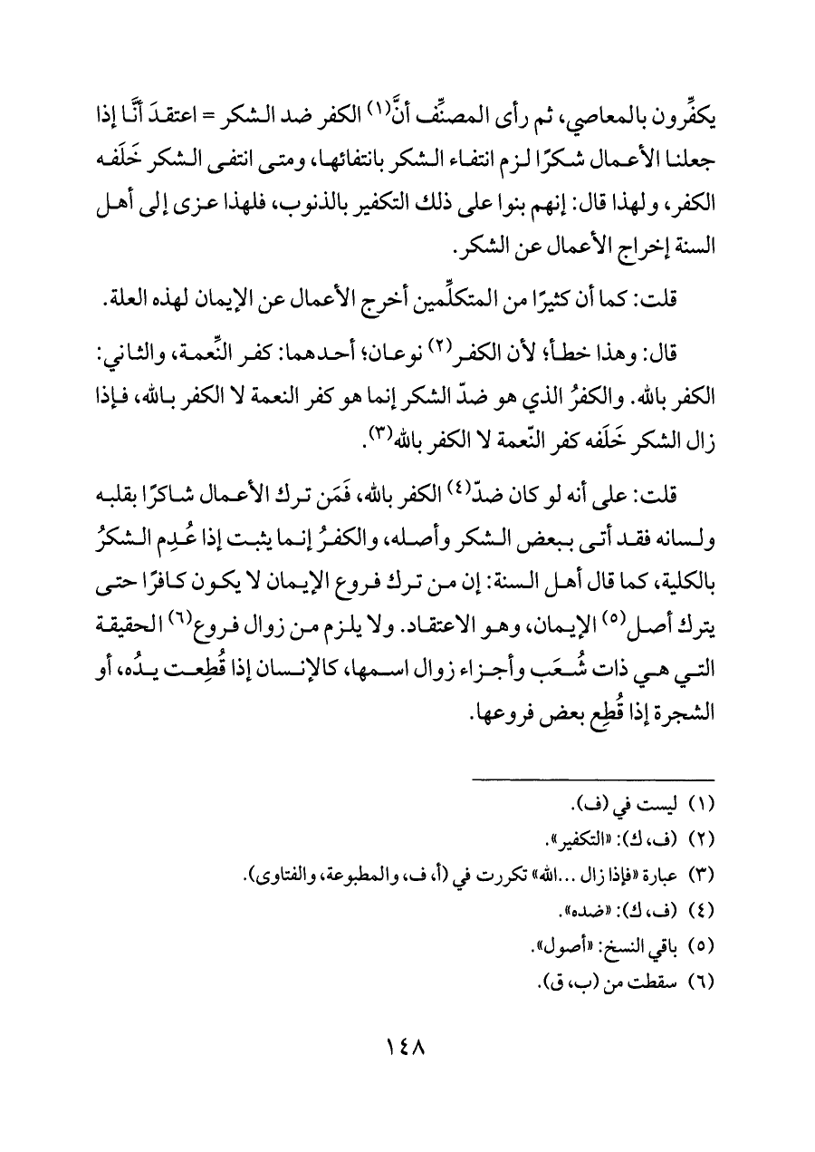 قلت: على أنه لو كان ضدّ (¬٤) الكفر بالله، فَمَن ترك الأعمال شاكرًا بقلبه ولسانه فقد أتى ببعض الشكر وأصله، والكفرُ إنما يثبت إذا عُدِم الشكرُ بالكلية، كما قال أهل السنة: إن من ترك فروع الإيمان لا يكون كافرًا حتى يترك أصل (¬٥) الإيمان، وهو الاعتقاد. ولا يلزم من زوال فروع (¬٦) الحقيقة التي هي ذات شُعَب وأجزاء زوال اسمها، كالإنسان إذا قُطِعت يدُه، أو الشجرة إذا قُطِع بعض فروعها.