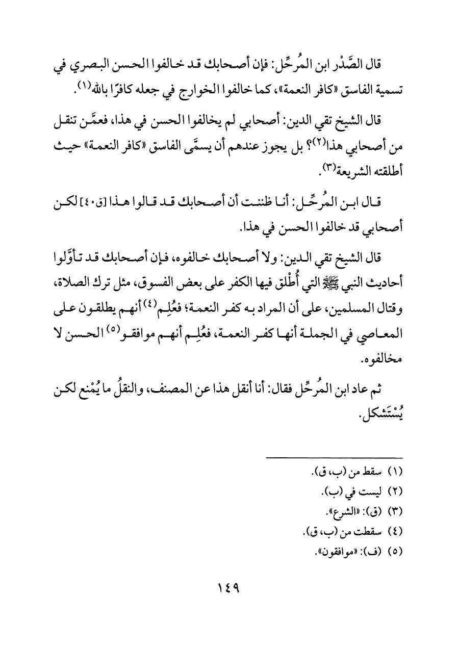 قال الشيخ تقي الدين: ولا أصحابك خالفوه، فإن أصحابك قد تأوَّلوا أحاديث النبي - صلى الله عليه وسلم - التي أُطْلق فيها الكفر على بعض الفسوق، مثل ترك الصلاة، وقتال المسلمين، على أن المراد به كفر النعمة؛ فعُلِم (¬٤) أنهم يطلقون على المعاصي في الجملة أنها كفر النعمة، فعُلِم أنهم موافقو (¬٥) الحسن لا مخالفوه.