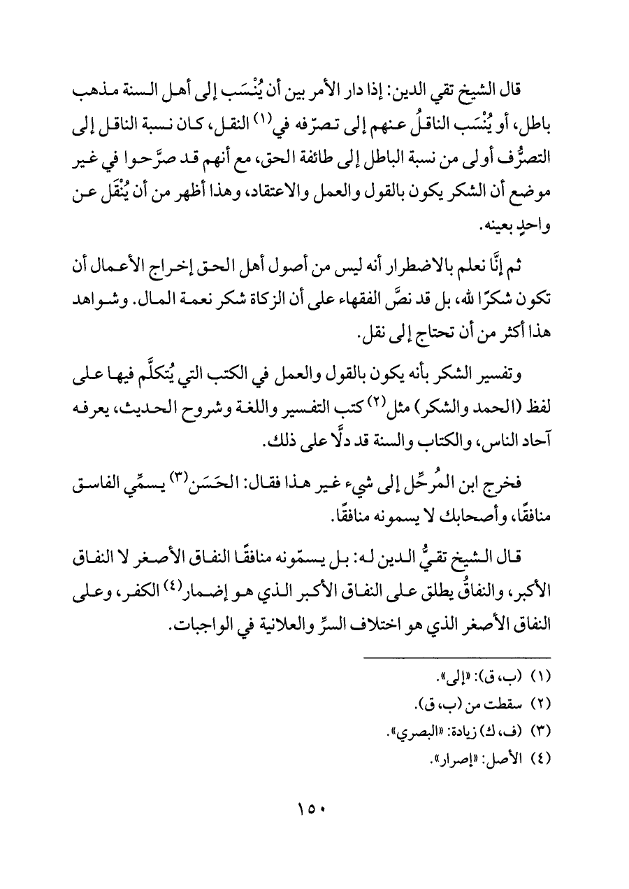 قال الشيخ تقي الدين: إذا دار الأمر بين أن يُنْسَب إلى أهل السنة مذهب باطل، أو يُنْسَب الناقلُ عنهم إلى تصرّفه في (¬١) النقل، كان نسبة الناقل إلى التصرُّف أولى من نسبة الباطل إلى طائفة الحق، مع أنهم قد صرَّحوا في غير موضع أن الشكر يكون بالقول والعمل والاعتقاد، وهذا أظهر من أن يُنْقَل عن واحدٍ بعينه.