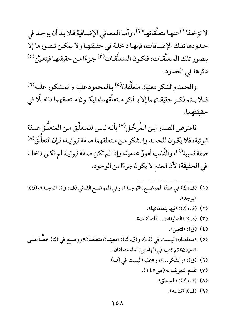 لا تؤخذ (¬١) عنها متعلَّقاتها (¬٢)، وأما المعاني الإضافية فلا بد أن يوجد في حدودها تلك الإضافات، فإنها داخلة في حقيقتها ولا يمكن تصورها إلا بتصور تلك المتعلَّقات، فتكون المتعلَّقات (¬٣) جزءًا من حقيقتها فيتعيَّن (¬٤) ذكرها في الحدود.