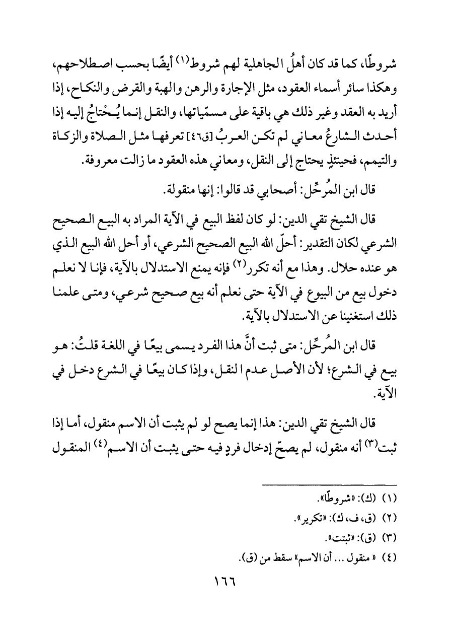 قال الشيخ تقي الدين: لو كان لفظ البيع في الآية المراد به البيع الصحيح الشرعي لكان التقدير: أحلّ الله البيع الصحيح الشرعي، أو أحل الله البيع الذي هو عنده حلال. وهذا مع أنه تكرر (¬٢) فإنه يمنع الاستدلال بالآية، فإنا لا نعلم دخول بيع من البيوع في الآية حتى نعلم أنه بيع صحيح شرعي، ومتى علمنا ذلك استغنينا عن الاستدلال بالآية.